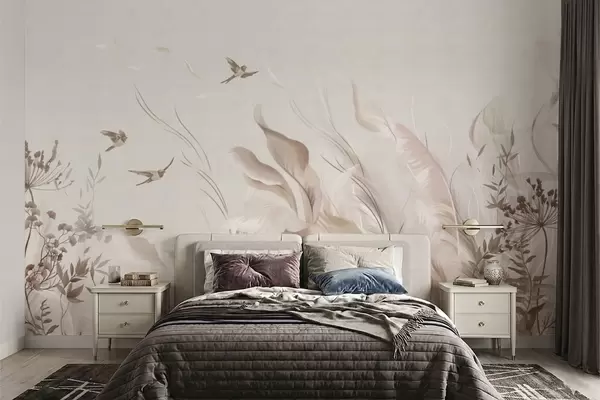 Fotobehang Zachte veren, grassen en vogels in lichte tinten N° w05395