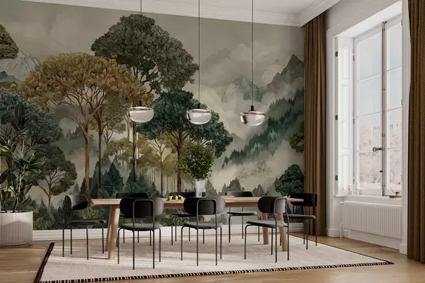 Fotobehang Bos met hoge bomen in mistige bergen N° w05410