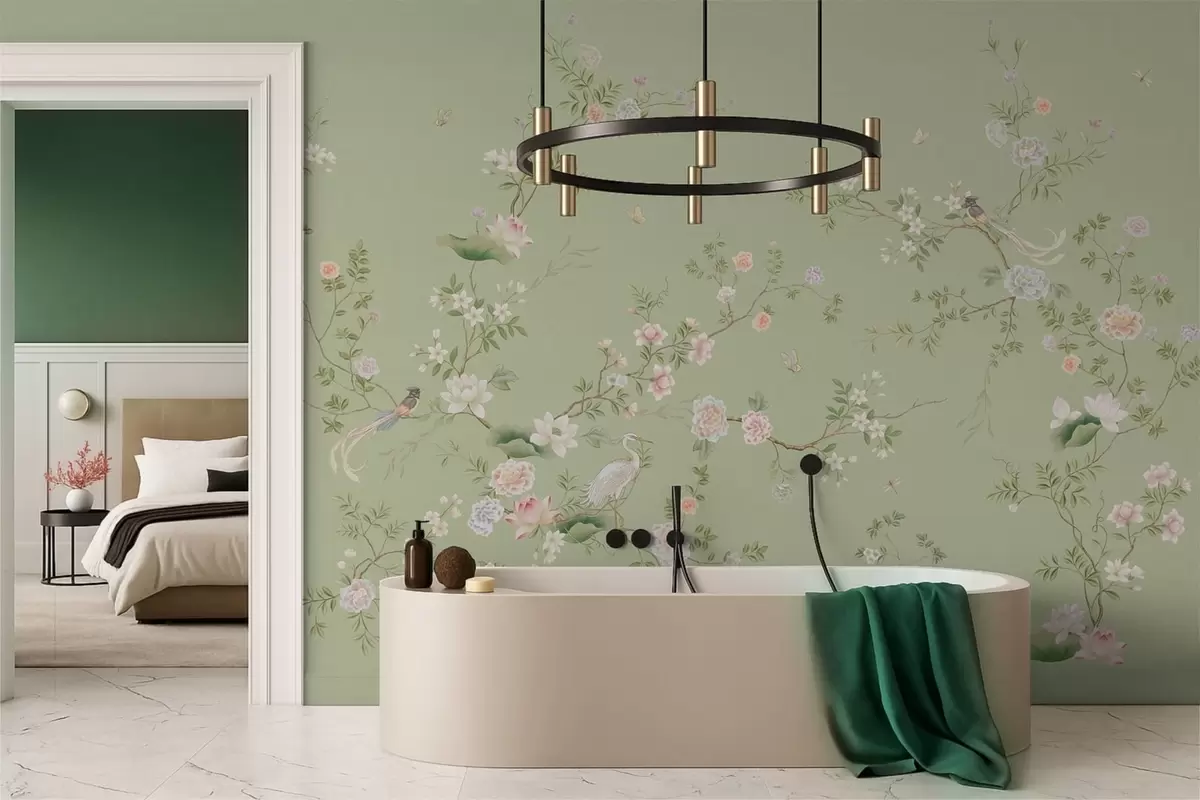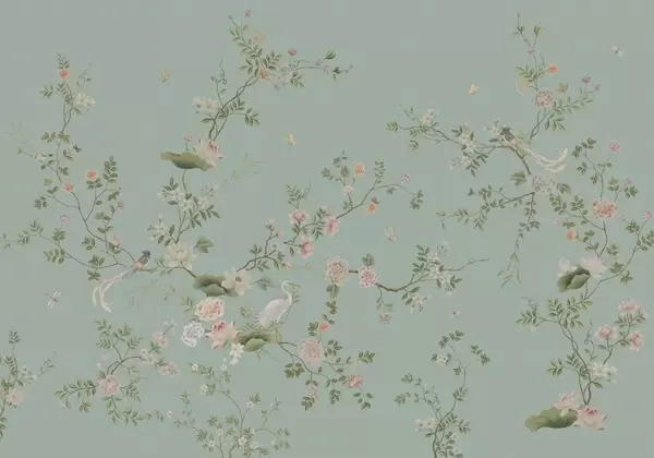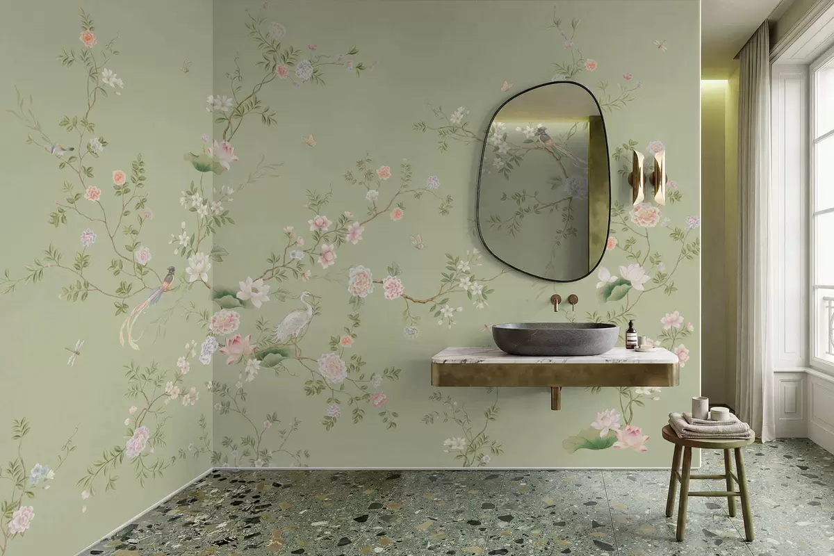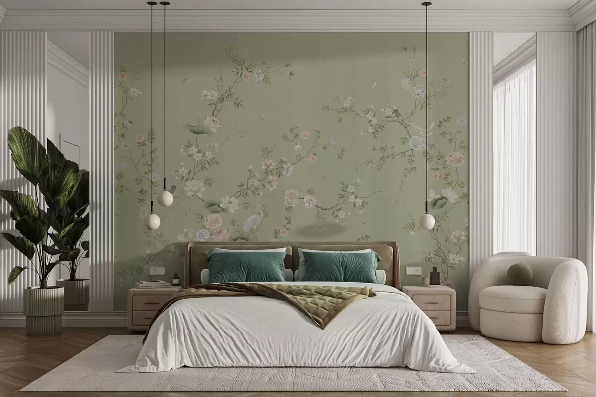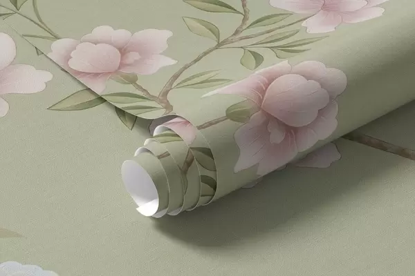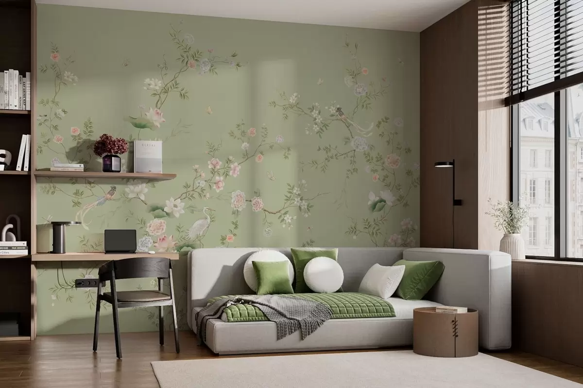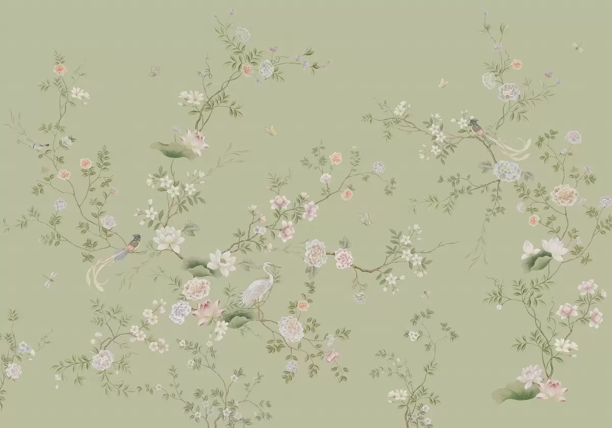 Fotobehang Bloeiende takken met vogels op lichtgroen N° w05416