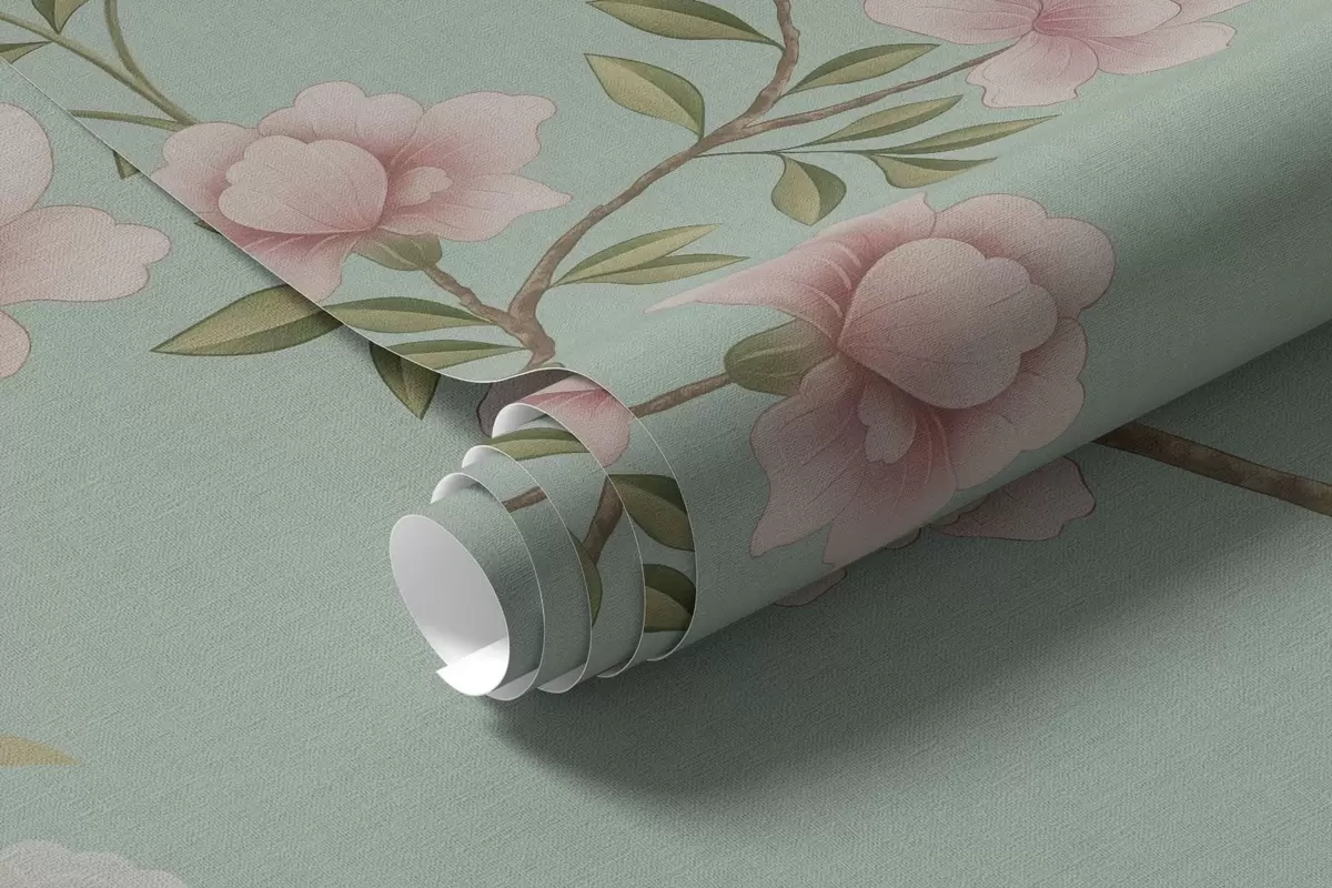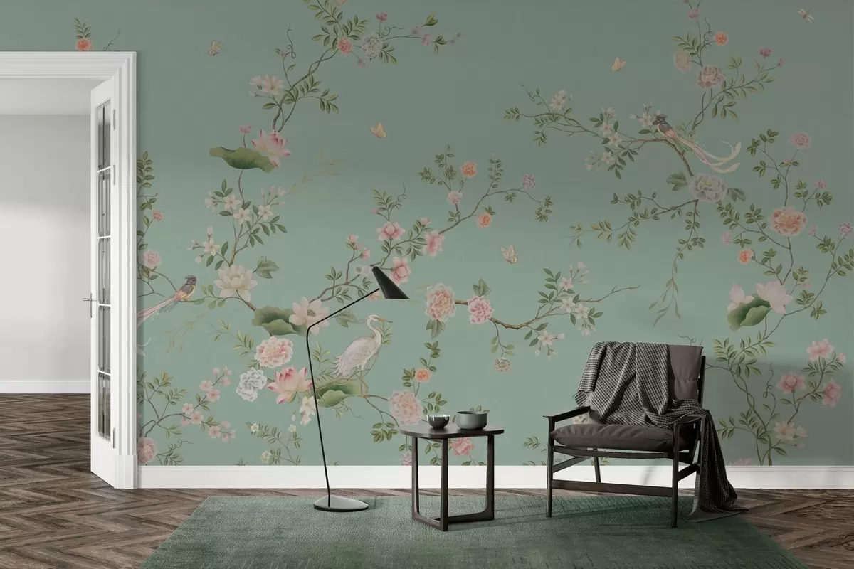 Fotobehang Bloeiende takken met vogels op een blauwe achtergrond N° w05416v1