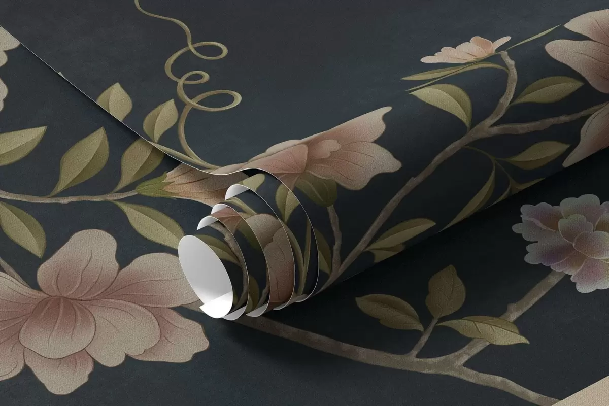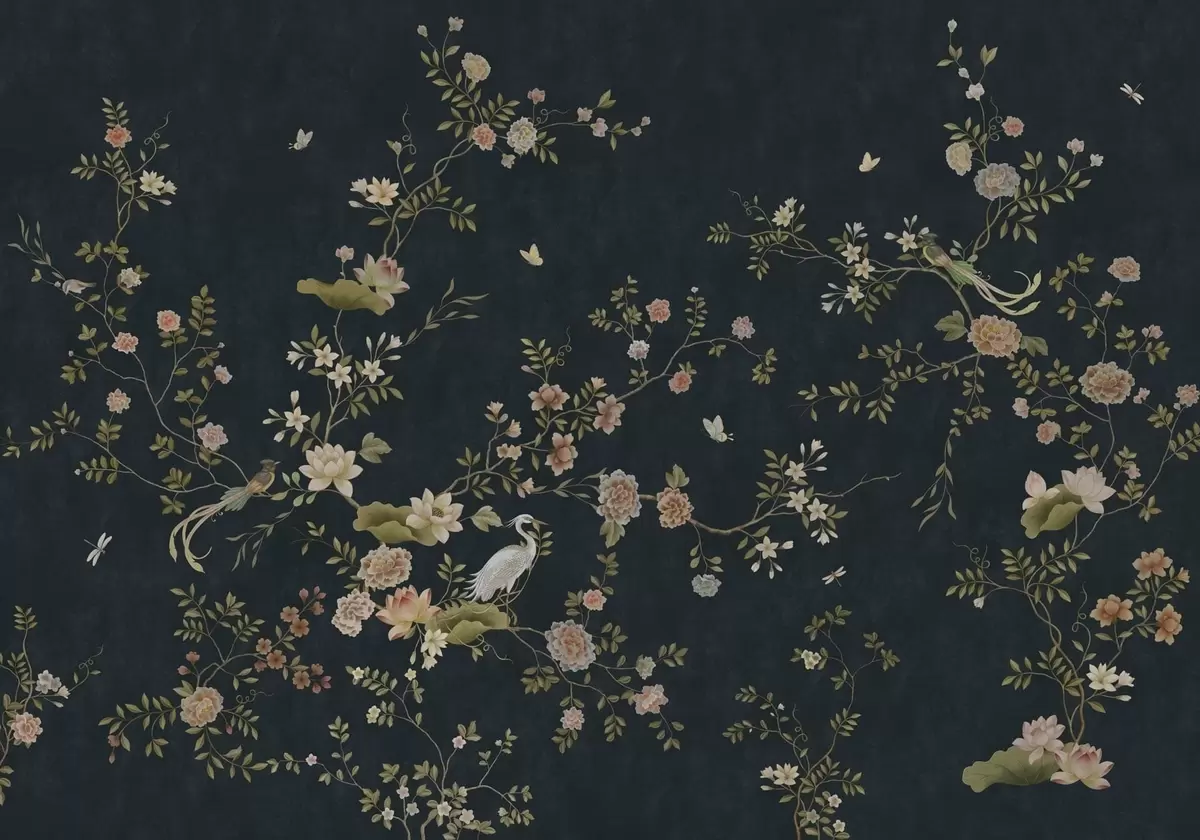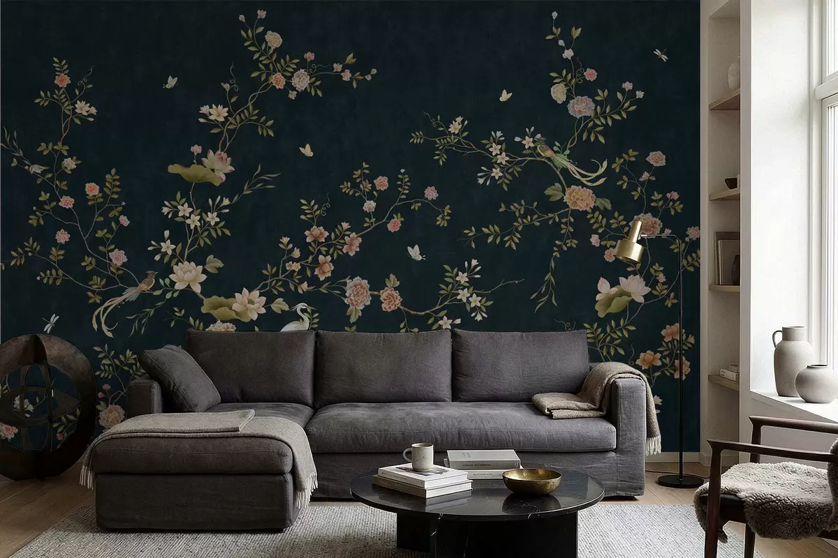 Fotobehang Bloeiende takken met vogels tegen een donkere achtergrond N° w05416v3
