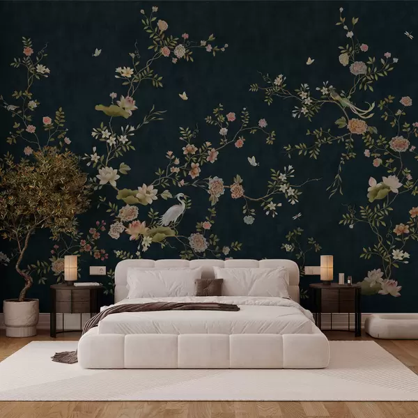 Fotobehang Bloeiende takken met vogels tegen een donkere achtergrond N° w05416v3