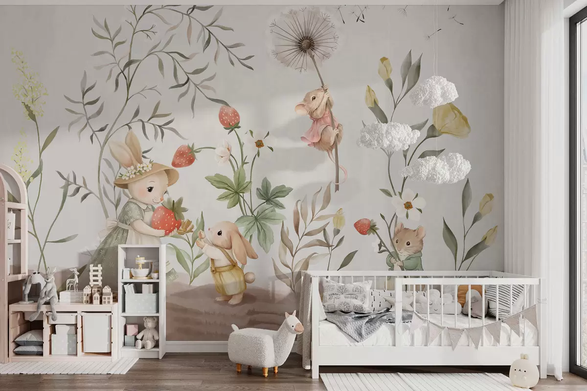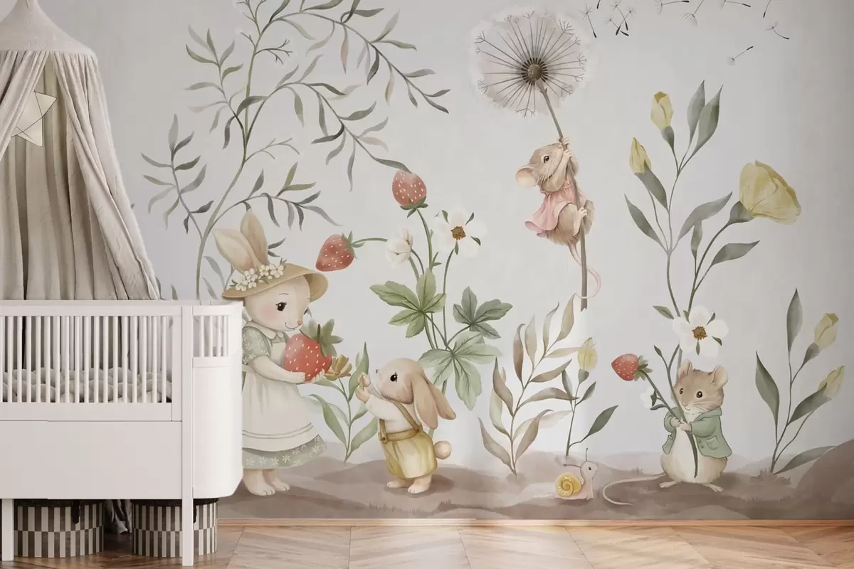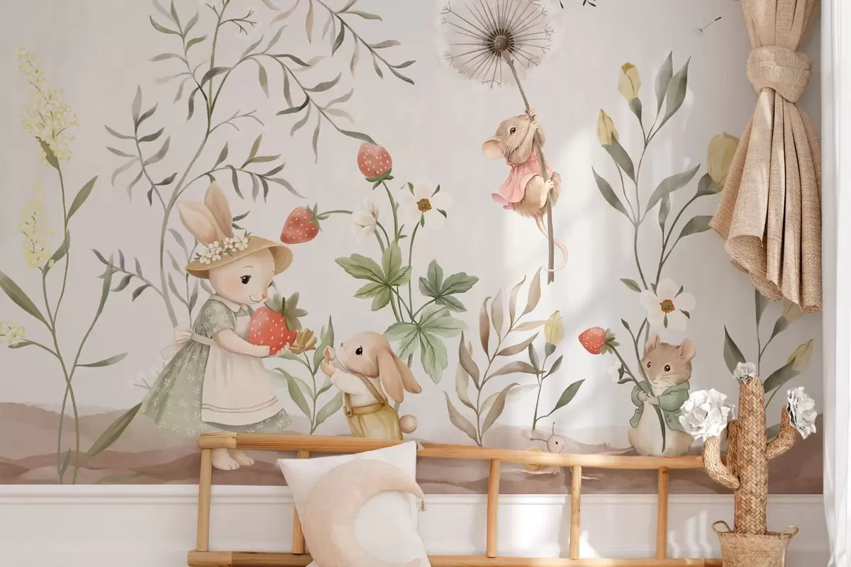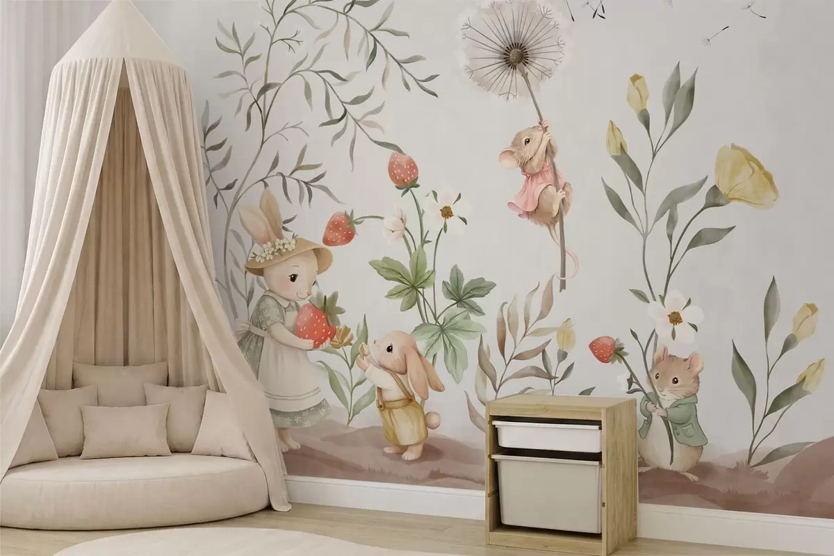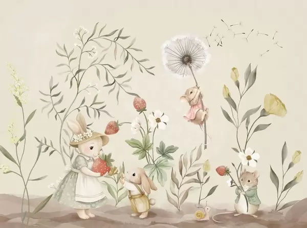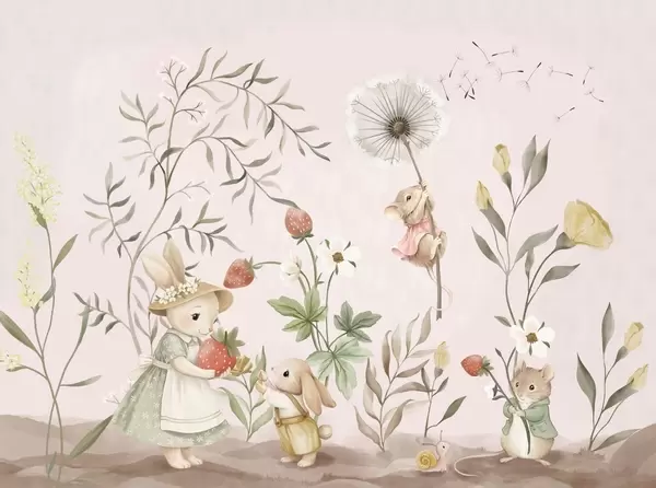 Fotobehang Kinderillustratie van een konijntje en een muis tussen planten en bloemen N° w05422