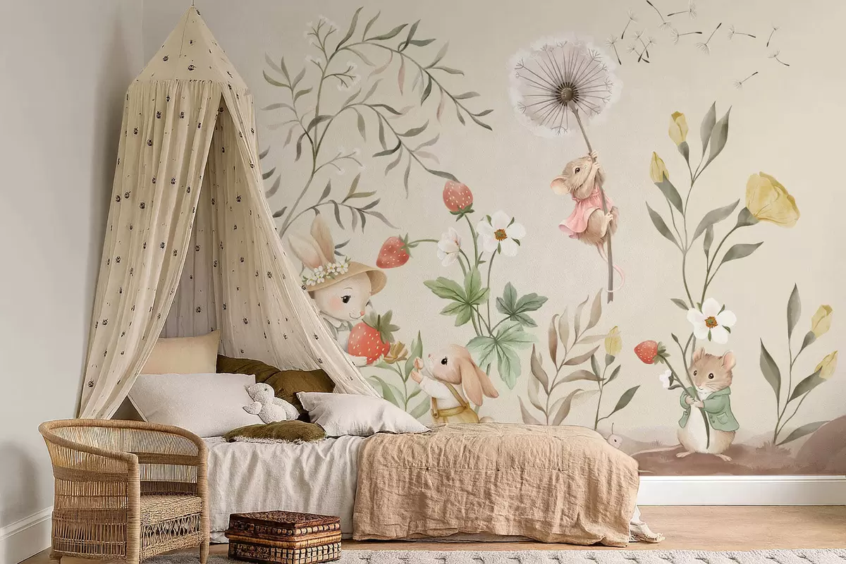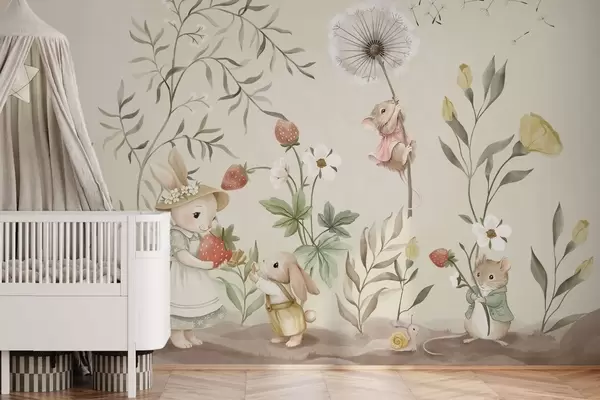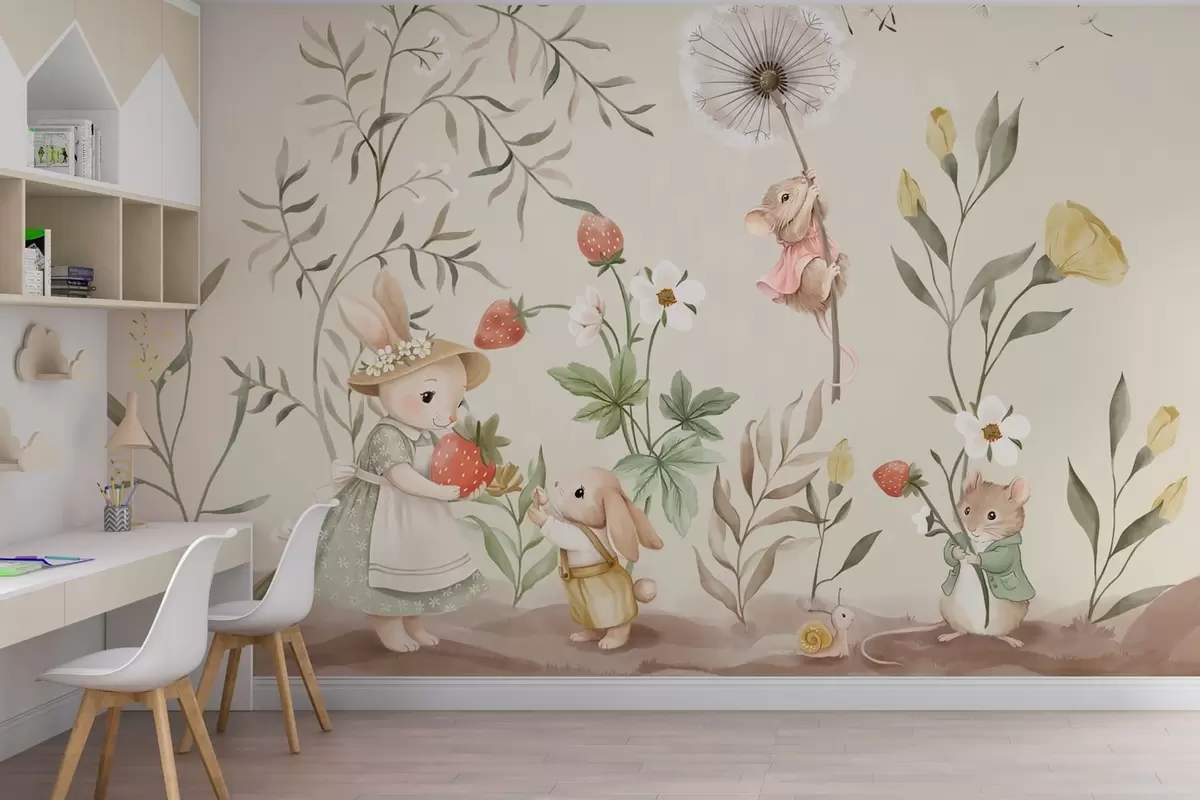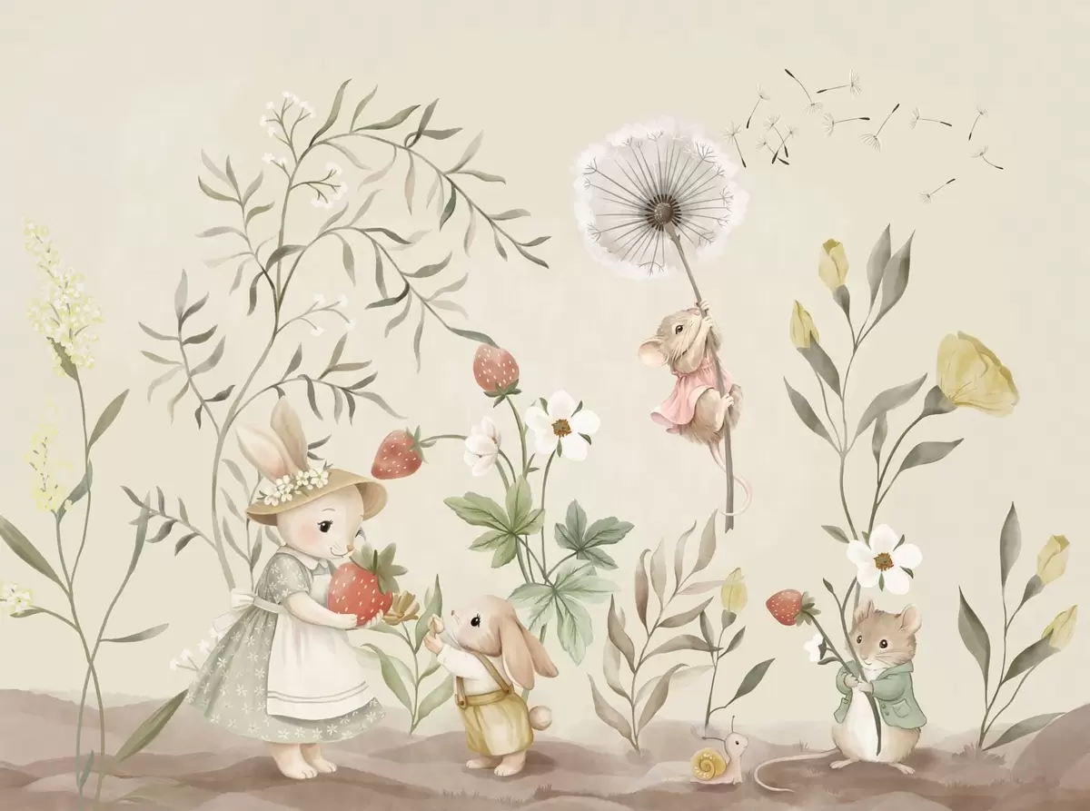 Fotobehang Illustratie van een konijntje, een muis en planten met aardbeien N° w05422v2
