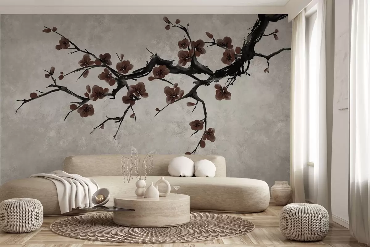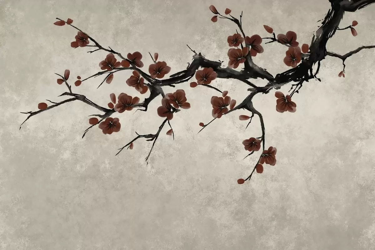 Fotobehang Tak met donkerrode bloesems tegen een neutrale achtergrond N° w05425v1