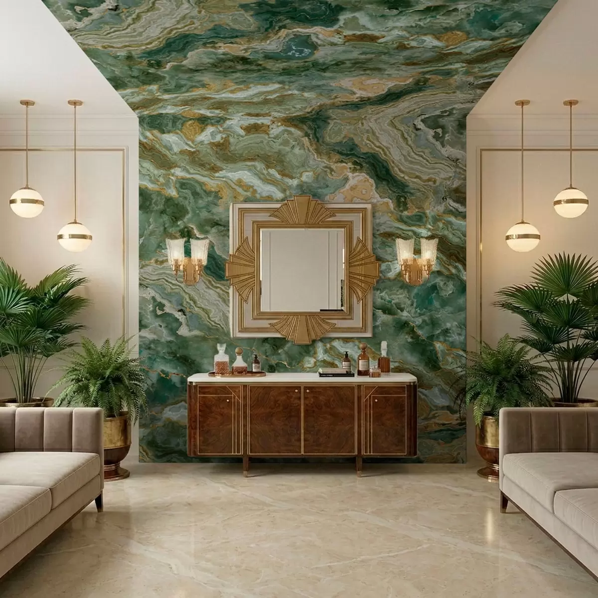 Fotobehang Groene onyxtextuur met vloeiende, gelaagde aders N° w05429