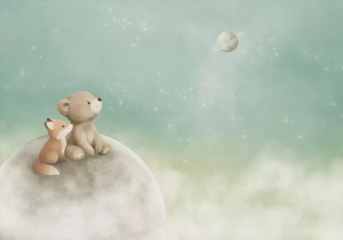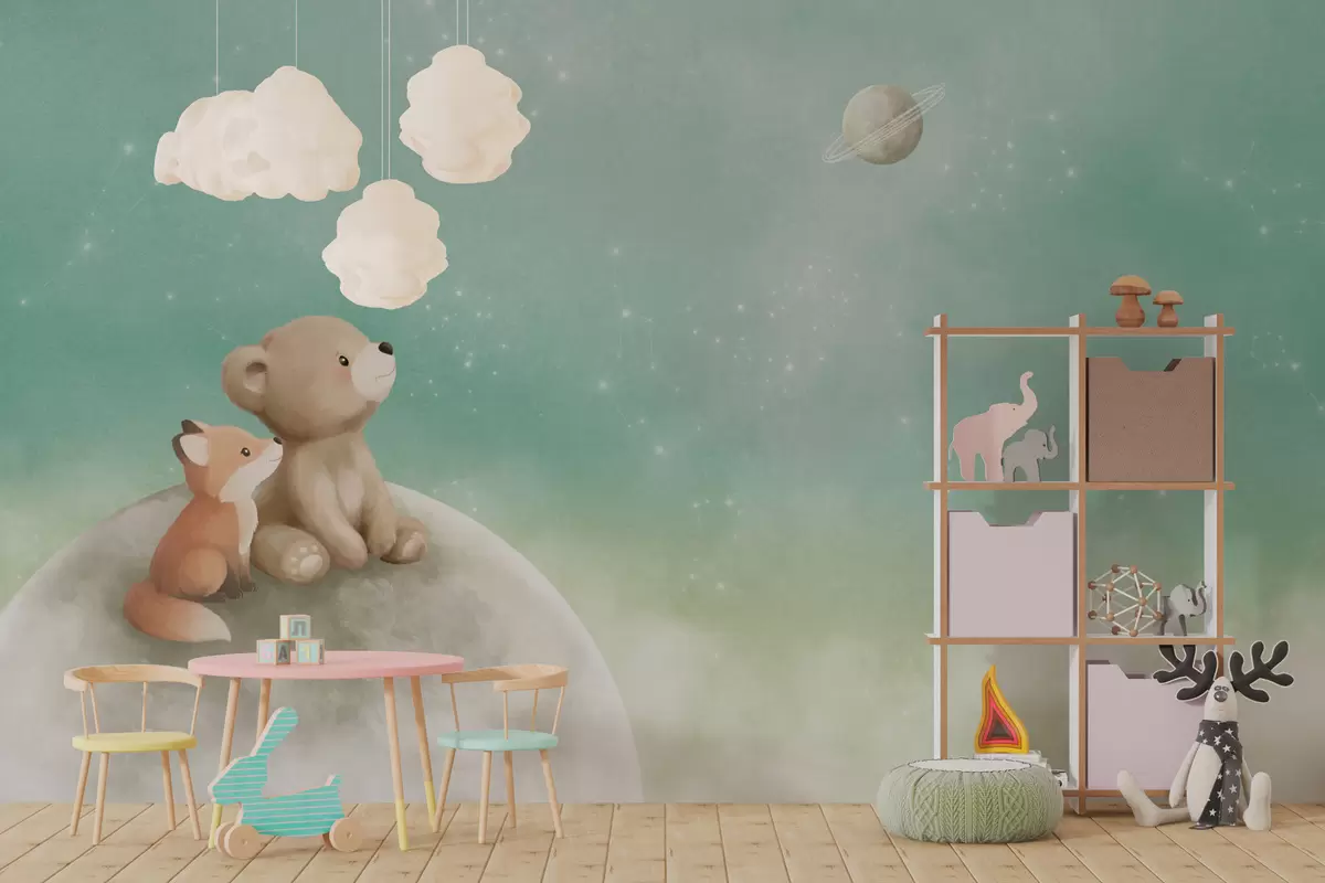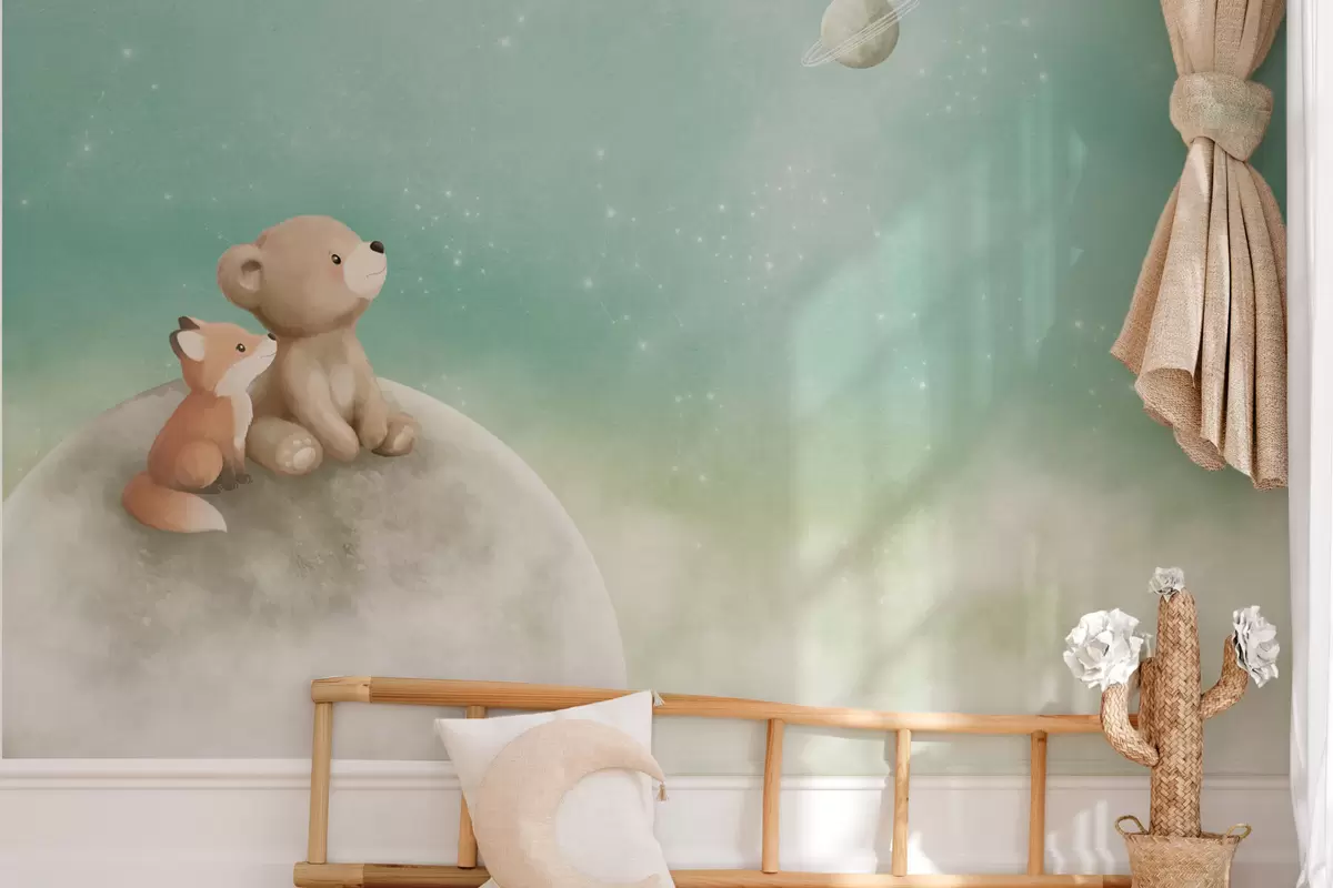 Fotobehang Pastelillustratie van een beer en een vos tegen een groene lucht N° w05431v1
