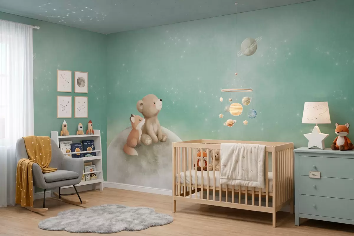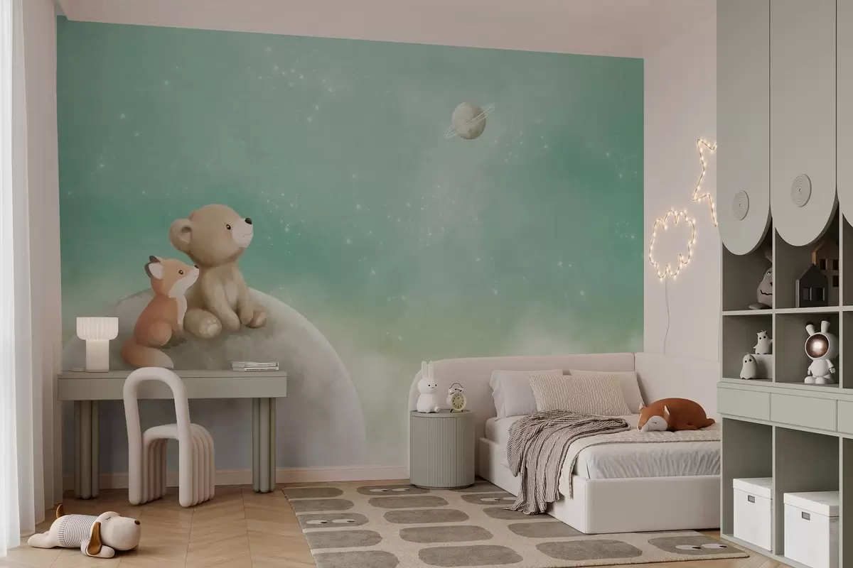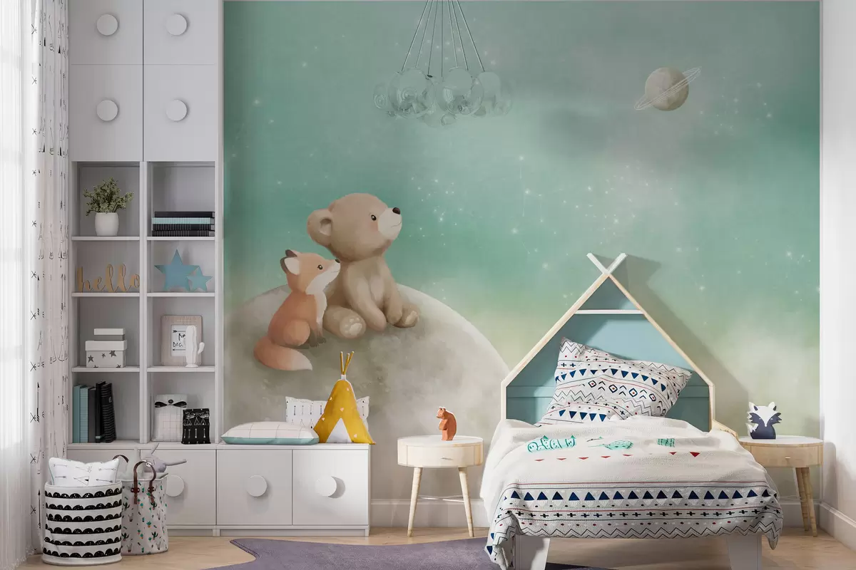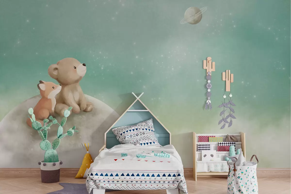Fotobehang Pastelillustratie van een beer en een vos tegen een groene lucht N° w05431v1