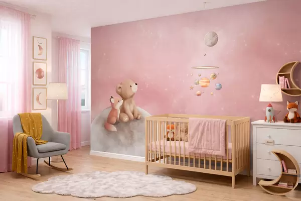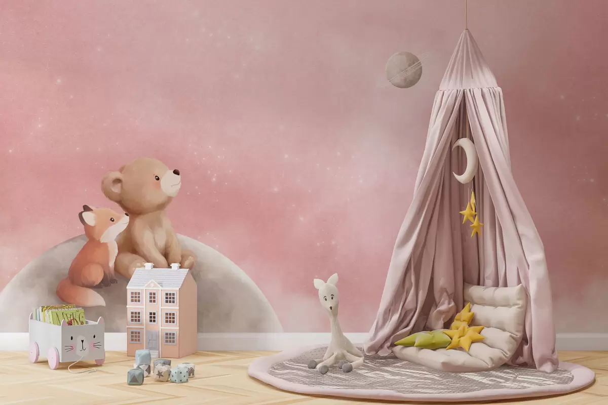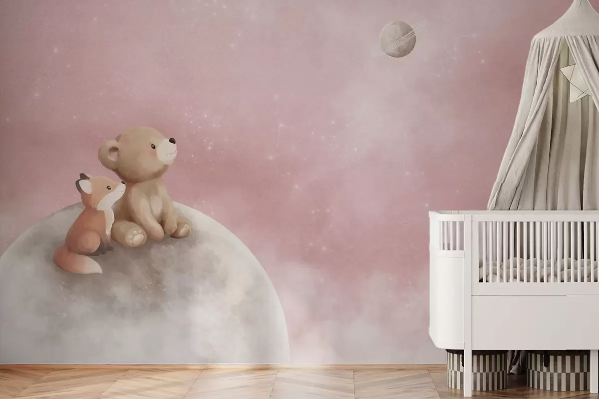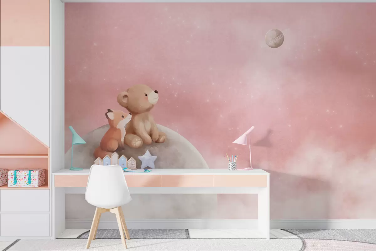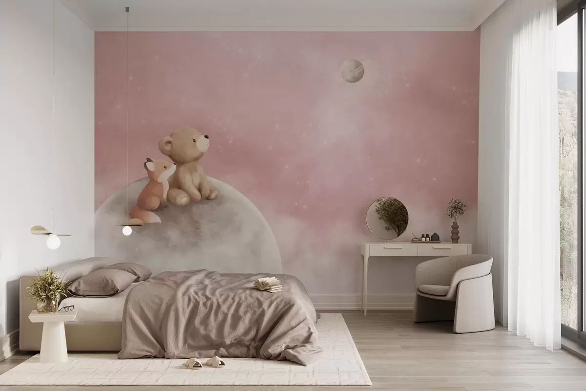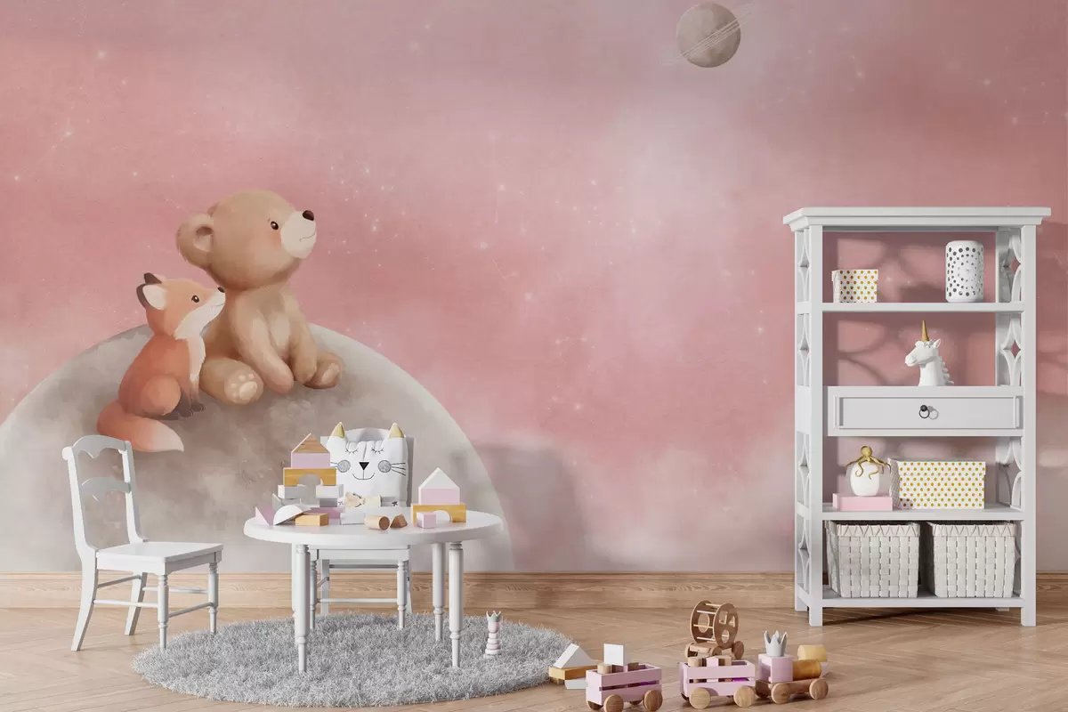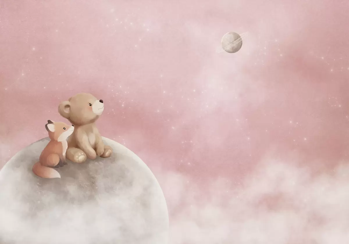 Fotobehang Pastelillustratie van een beer en een vos tegen een roze maanhemel N° w05431v2
