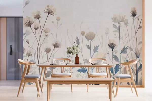 Fotobehang Wilde veldgrassen en bloemen, geschilderd in een landschappelijke stijl tegen een lichte achtergrond N° w05563