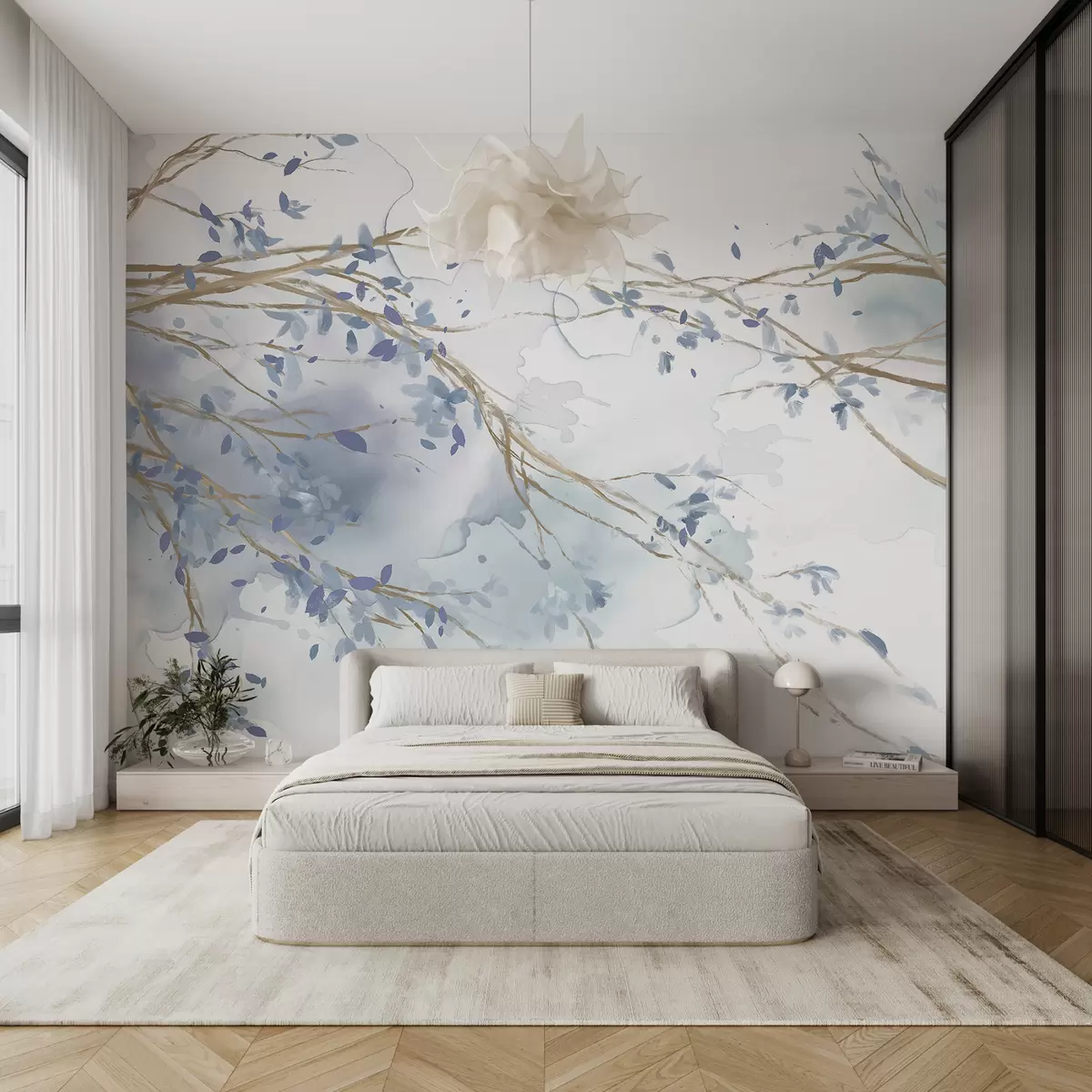 Fotobehang Fijne blauwe en witte bloementakken met zachte, wazige aquarelachtergrond N° w07919