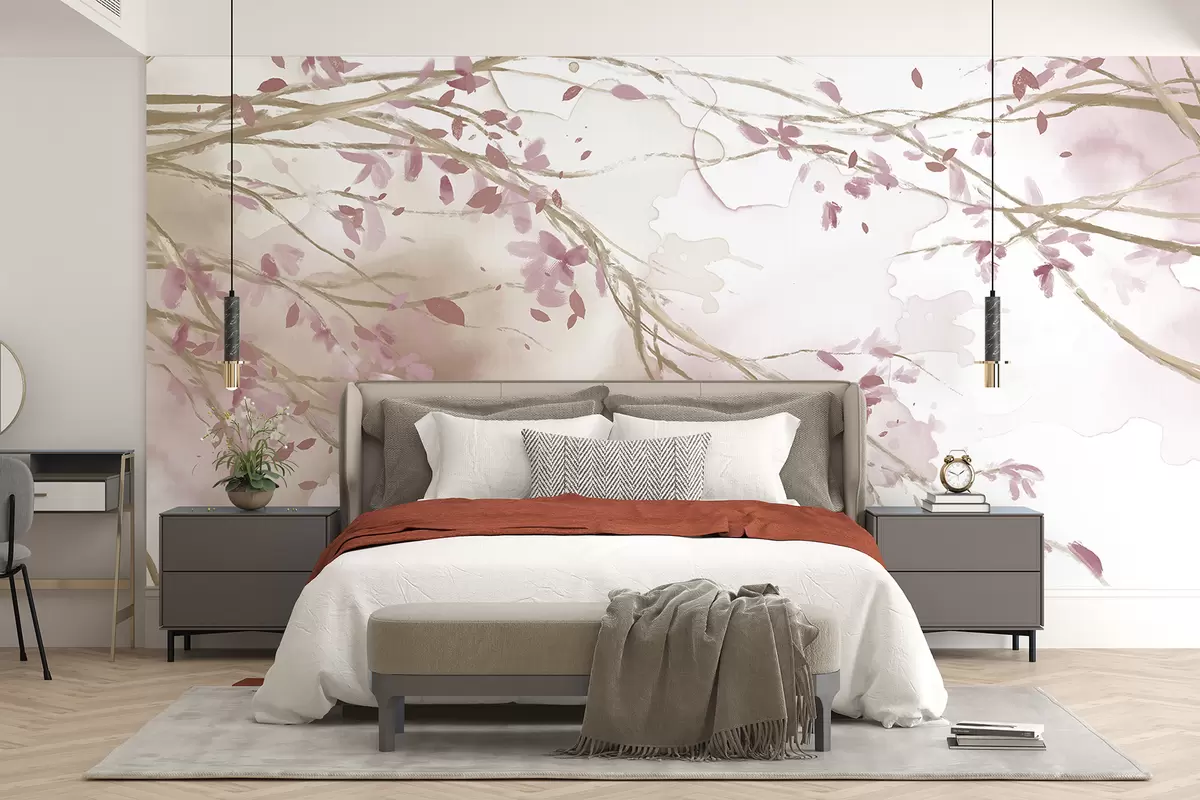 Fotobehang Fijne roze en witte bloementakken met zachte, wazige aquarelachtergrond N° w07919v1