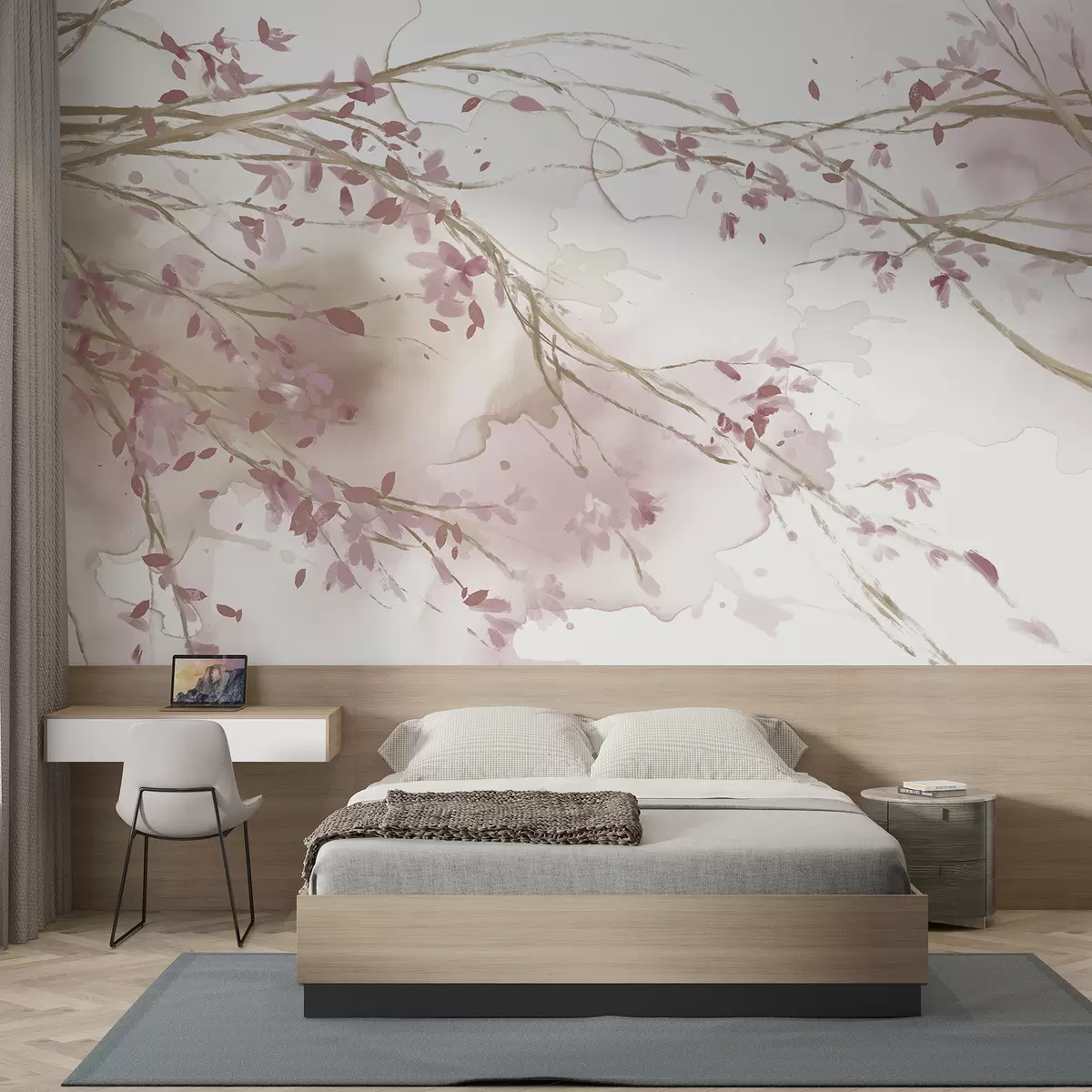 Fotobehang Fijne roze en witte bloementakken met zachte, wazige aquarelachtergrond N° w07919v1