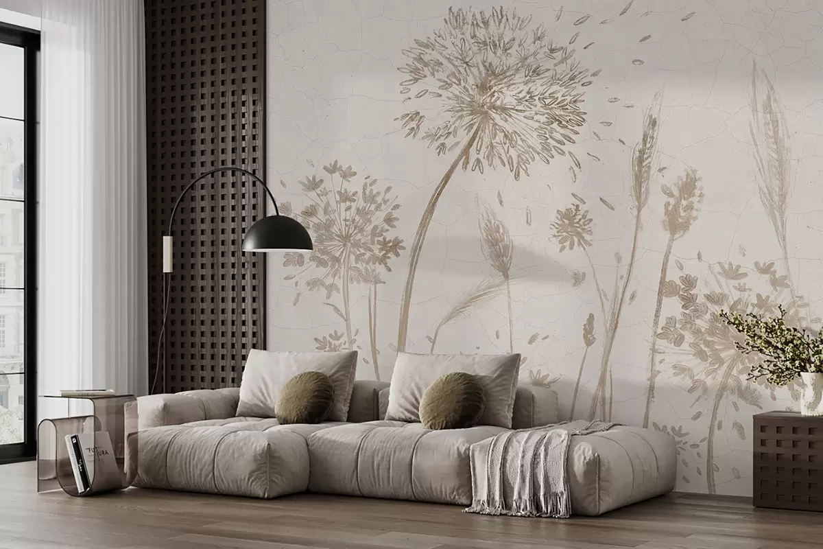 Fotobehang Een veld met paardebloemen en andere wilde bloemen tegen een zachte, wazige achtergrond N° w07921