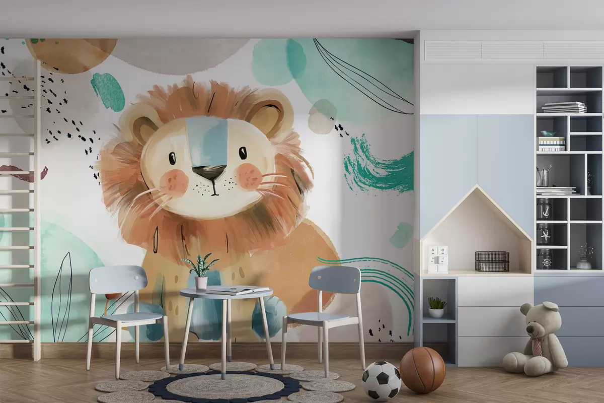 Fotobehang Een schattige tekenfilmleeuw op een kleurrijke, abstracte achtergrond met penseelstreken en spetters van pastelkleuren N° w07924