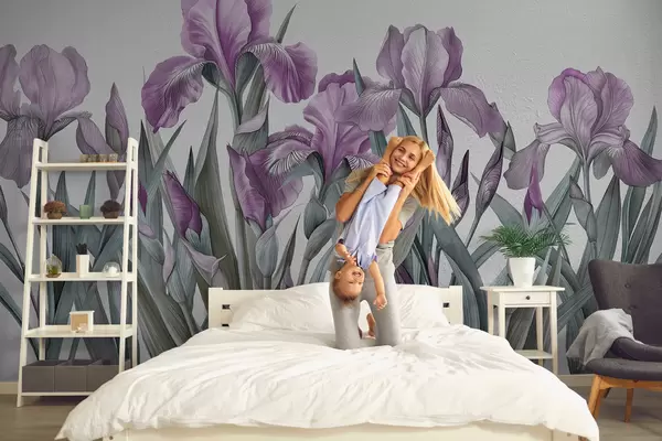 Fotobehang Grote geschilderde roze irissen op een witte betonnen muur N° w07949v1