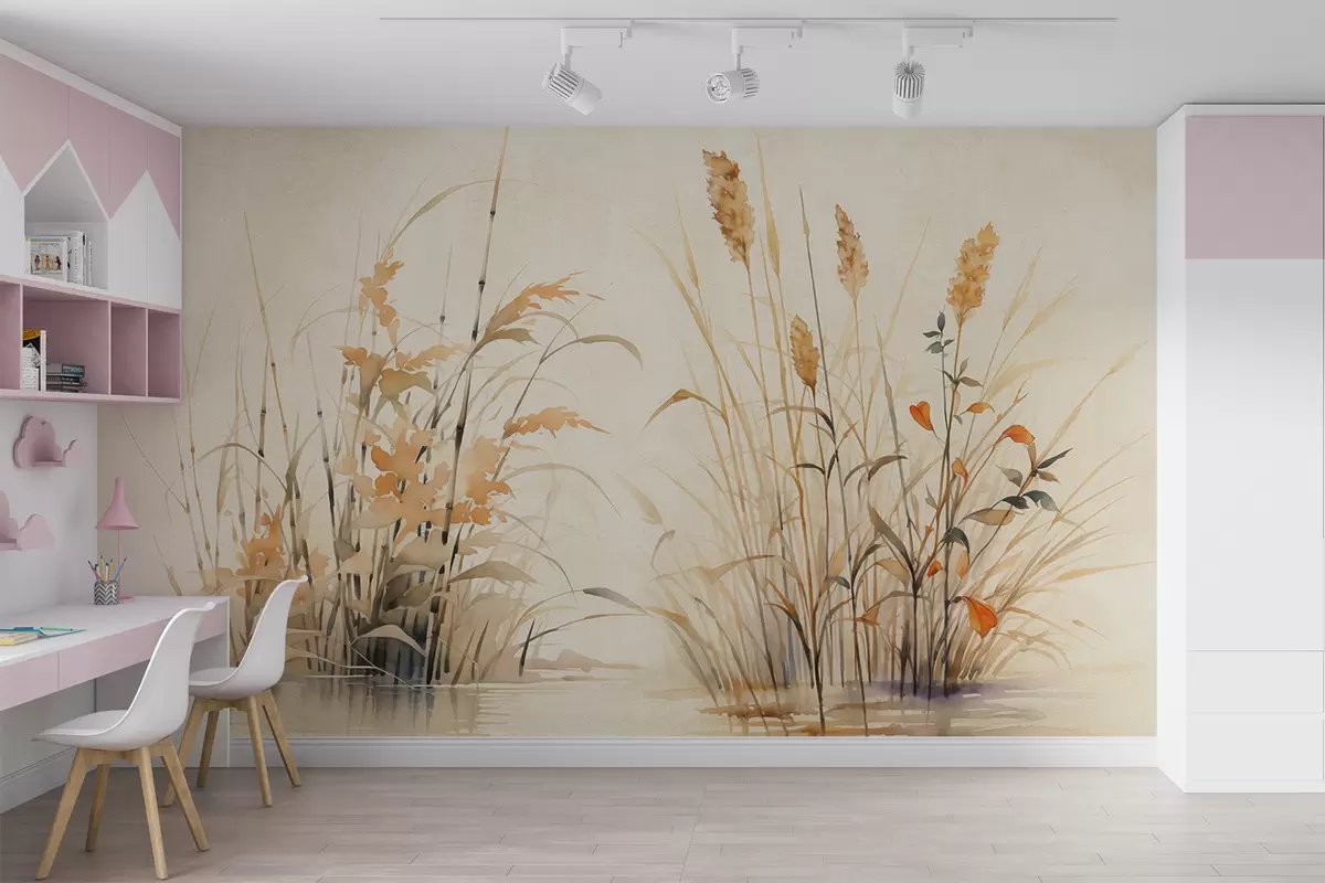 Fotobehang Rietstruiken in een vijvertextuur, aquarel, beige, oranje kleur N° w07964
