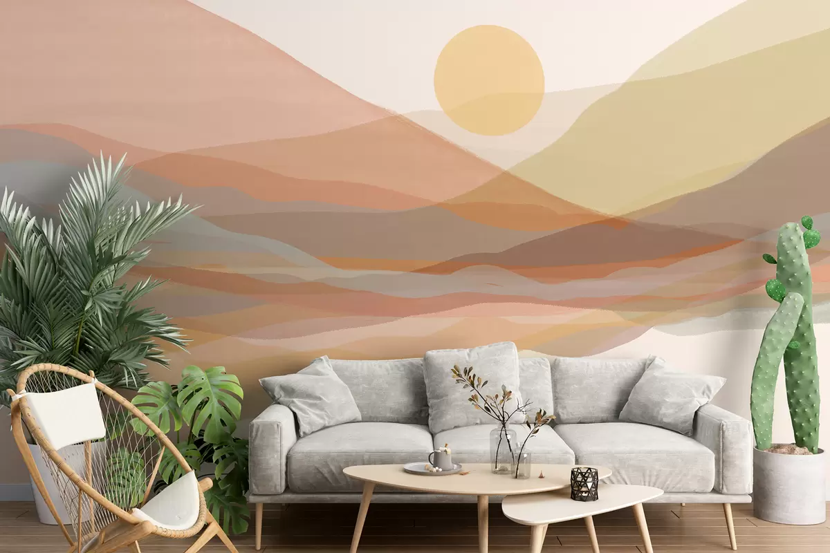 Fotobehang Bergachtig landschap met een warme zon aan de hemel, glooiende heuvels in de kleuren oranje, geel en bruin N° w07976