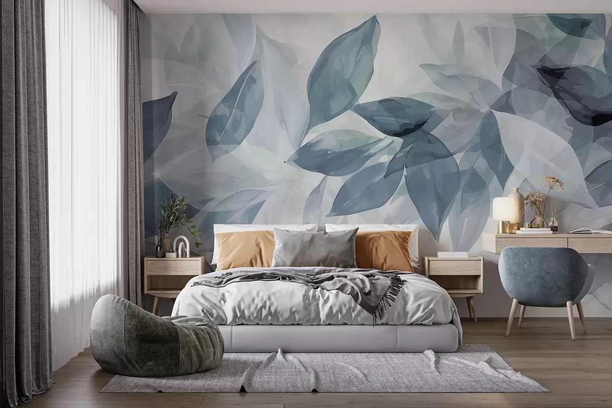Fotobehang Zachte grijze en witte aquarelbladeren met een wazige, etherische achtergrond N° w07981