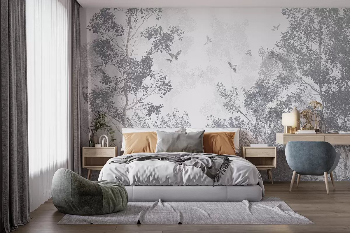 Fotobehang Bomen met grijze bladeren en takken met vliegende vogels in de lucht, witte achtergrond N° w07982v1