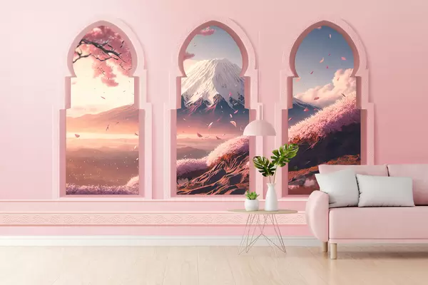 Fotobehang Grote ramen in oosterse stijl met een prachtig uitzicht op de berg Fuji in zachte perzikkleur N° w08082