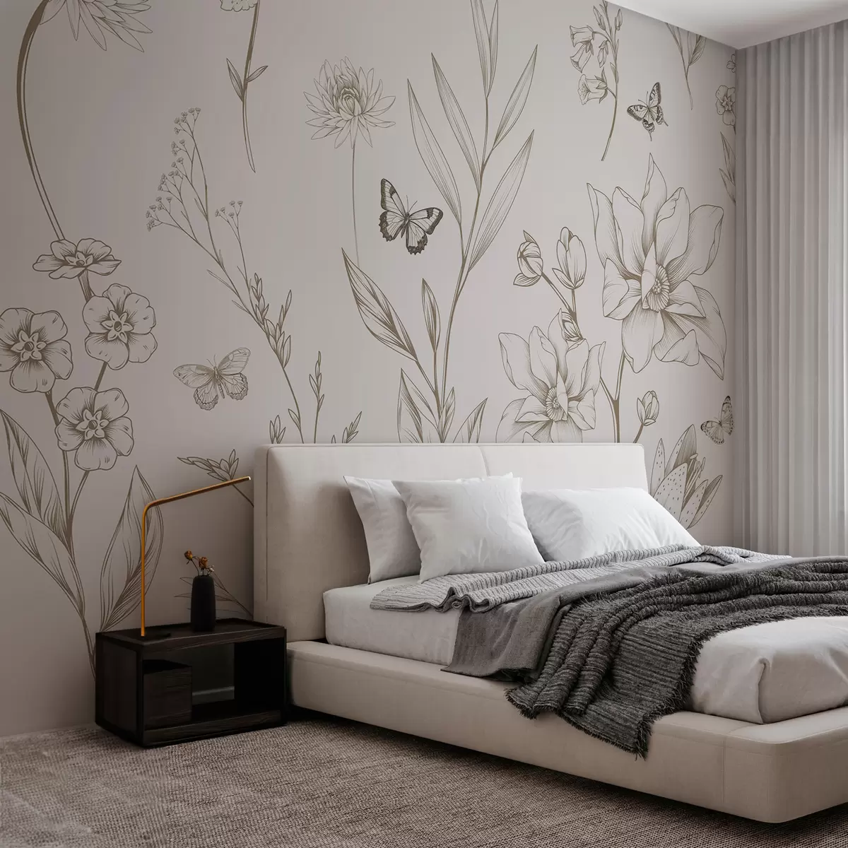 Fotobehang Boho monochrome bloemen en vlinders in beige kleur N° w08088v1