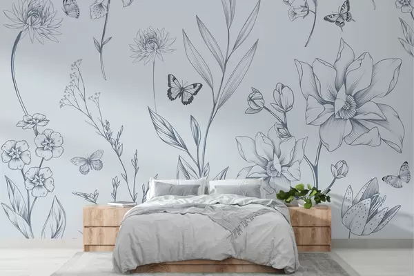 Fotobehang Boho monochrome bloemen en vlinders in blauw N° w08088v2
