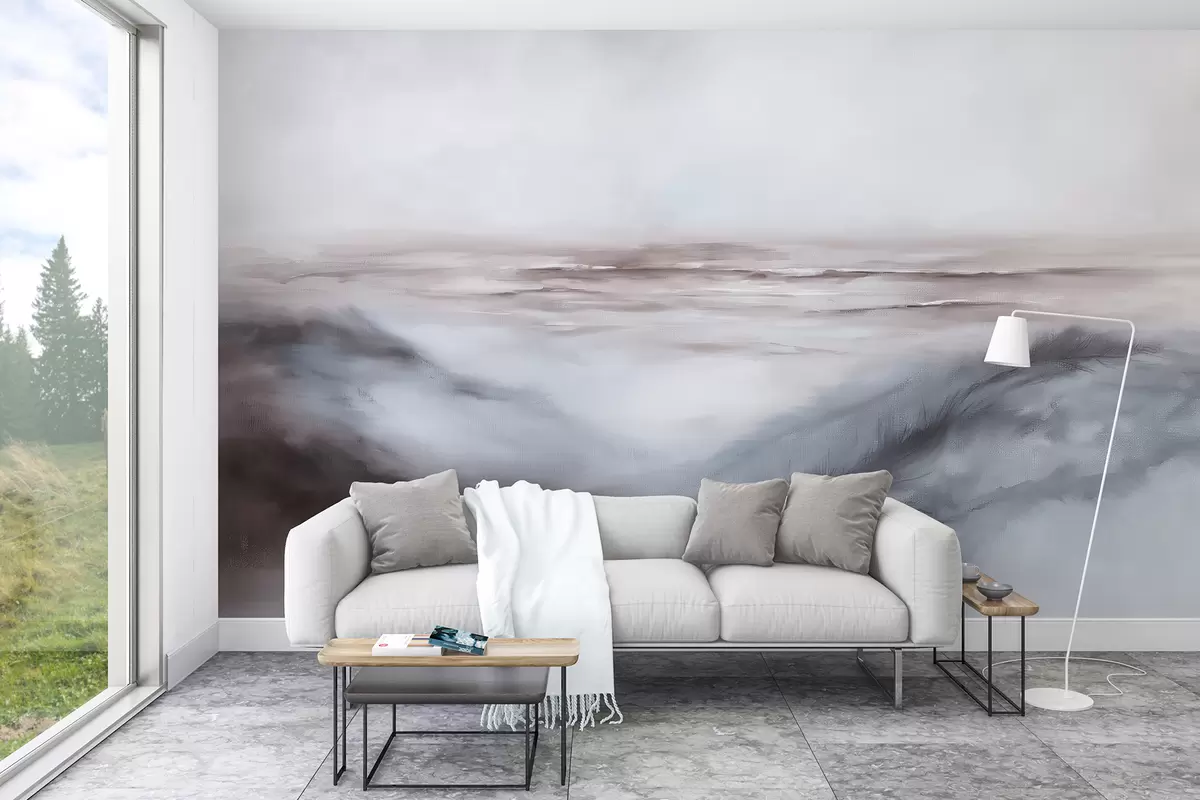 Fotobehang Abstract landschap in pastelkleuren, penseelstreken, strand, zee, grijs kleurenpalet N° w08141