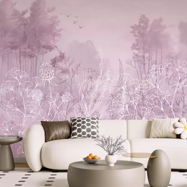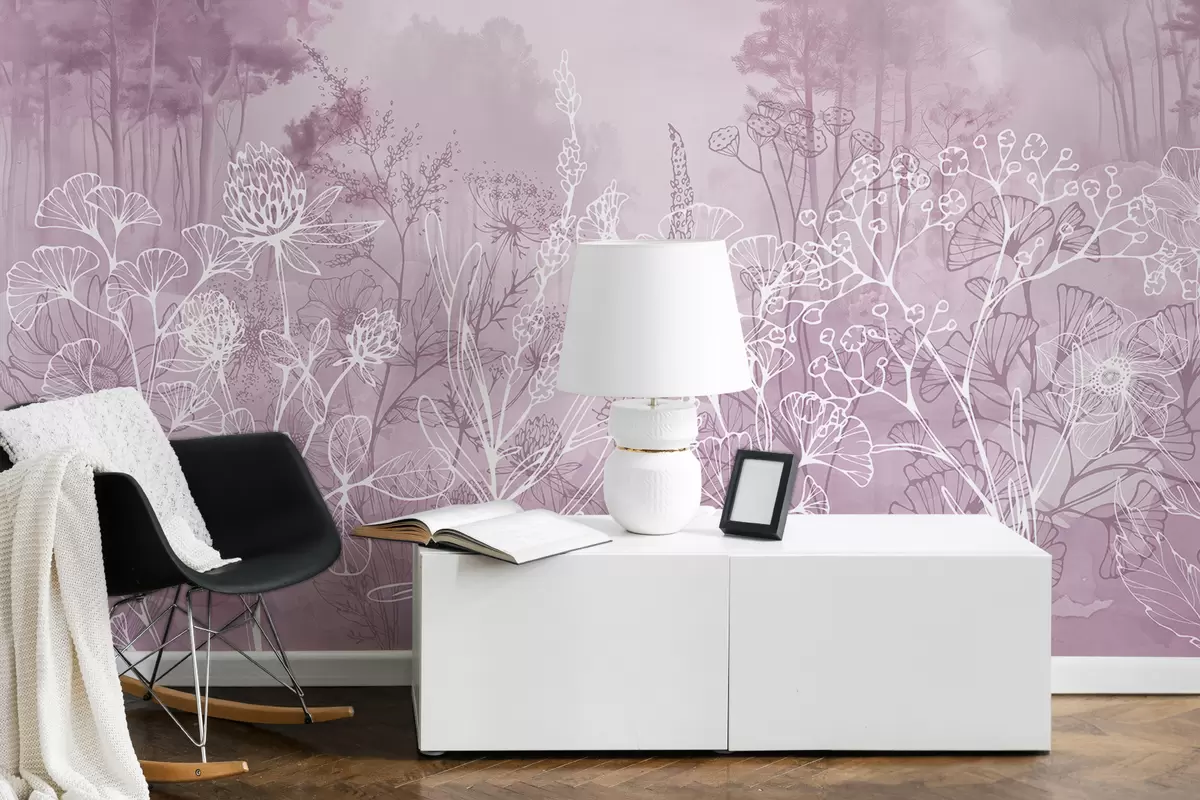 Fotobehang Lijntekening bloemen, boslandschap, natuur, realisme, roze kleurenpalet N° w08144v3