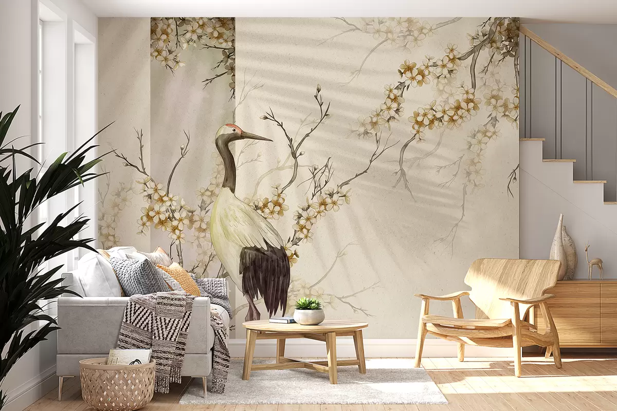 Fotobehang Een witte kraanvogel staat op een tak met bloeiende bloemen, tegen een zachte, wazige achtergrond N° w08159