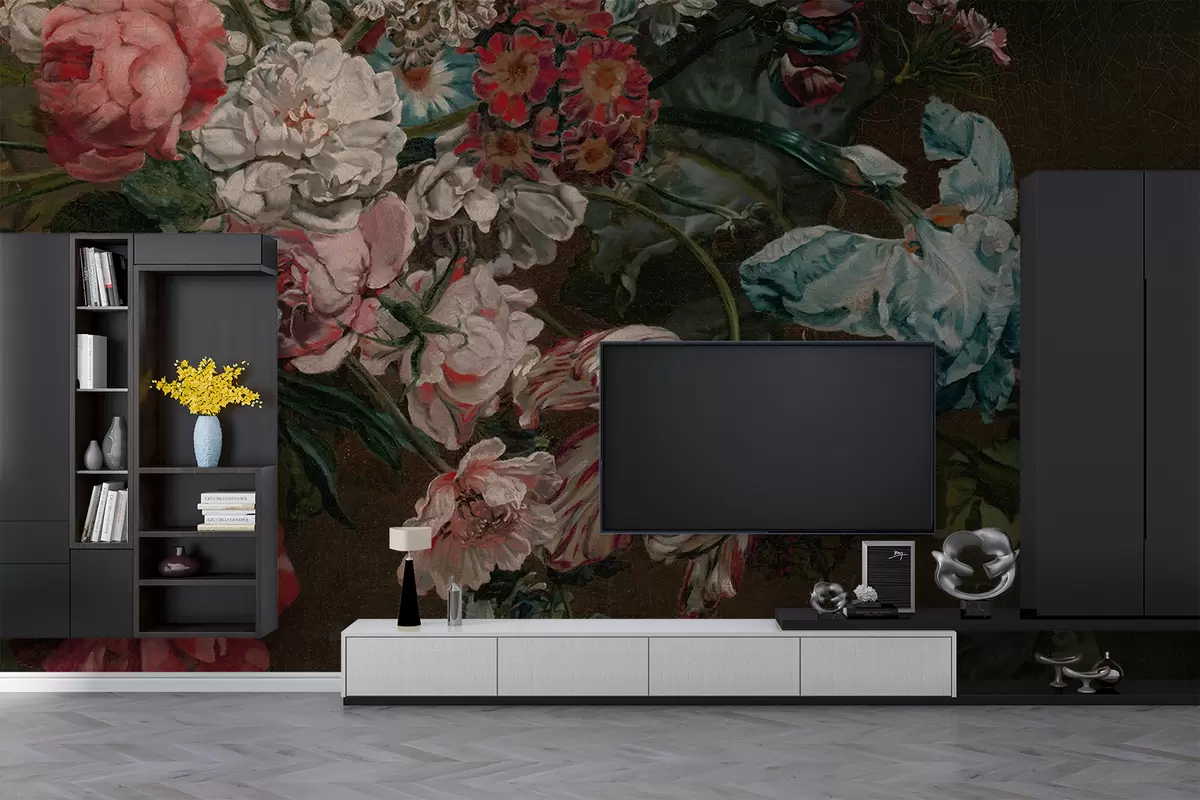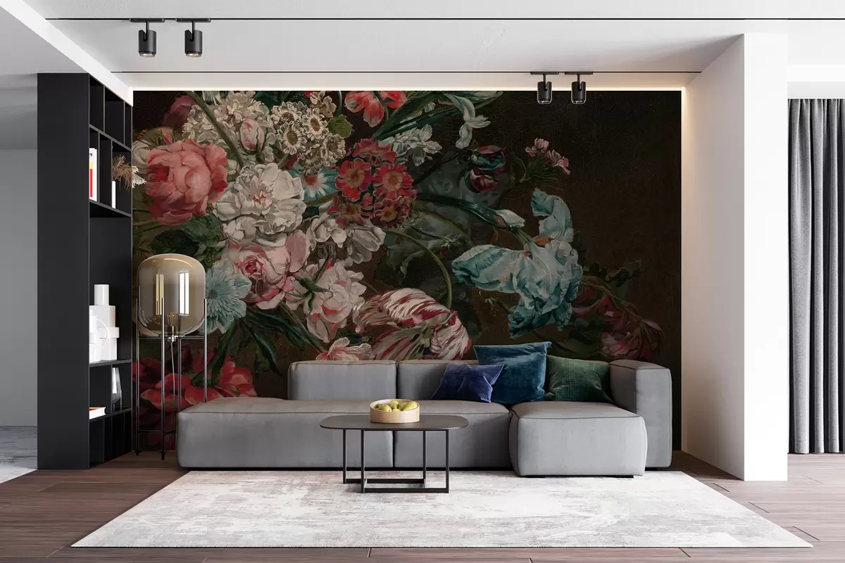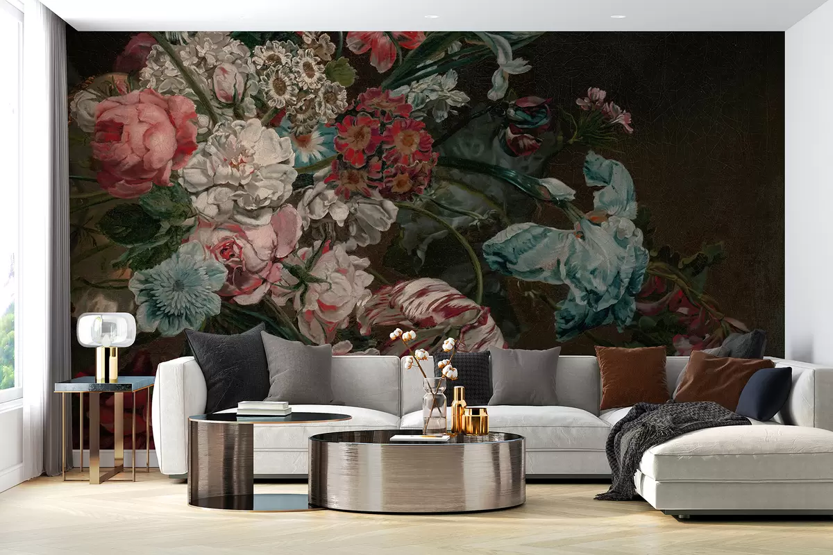Fotobehang Vintage kleurrijke bloemen, waaronder roze pioenrozen, rode anjers en witte lelies tegen een donkere achtergrond N° w08163