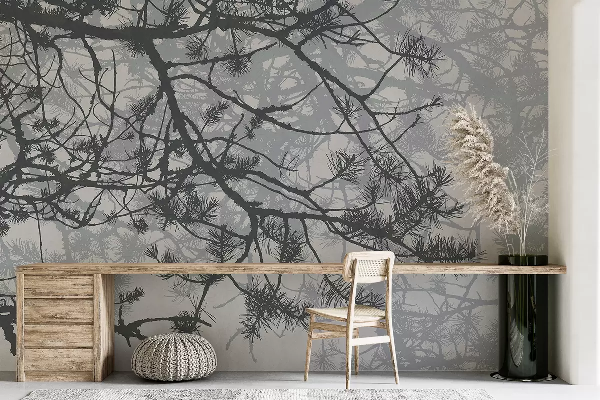 Fotobehang takken van een grote boom in grijstinten N° w08166