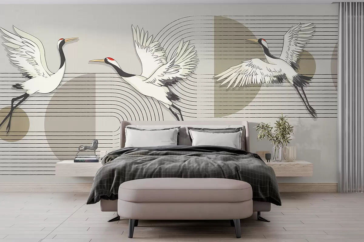 Fotobehang Drie witte kraanvogels in vlucht tegen een geometrische minimalistische achtergrond met concentrische cirkels N° w08188