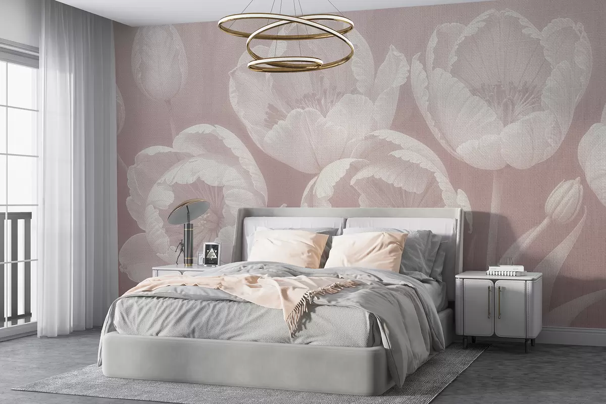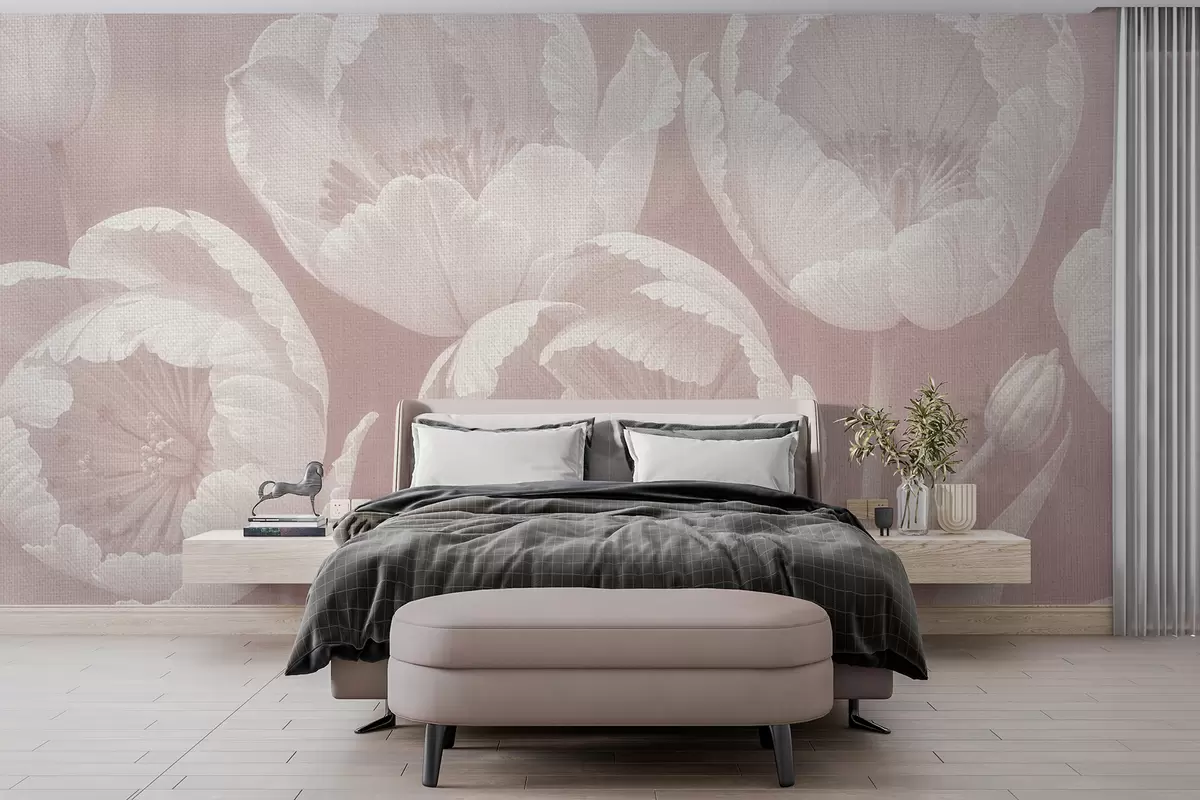 Fotobehang Tekening van witte tulpen met zachte, canvas textuur beige wazige achtergrond minimalisme monochrome print N° w08193