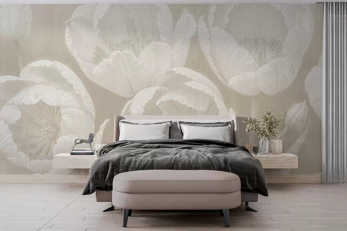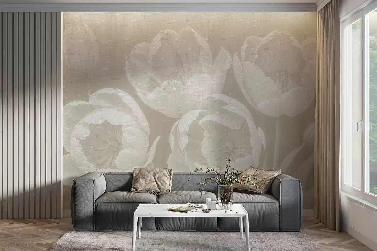 Fotobehang Tekening van witte tulpen met zachte, canvas textuur roze wazige achtergrond minimalistische monochrome print N° w08193v1
