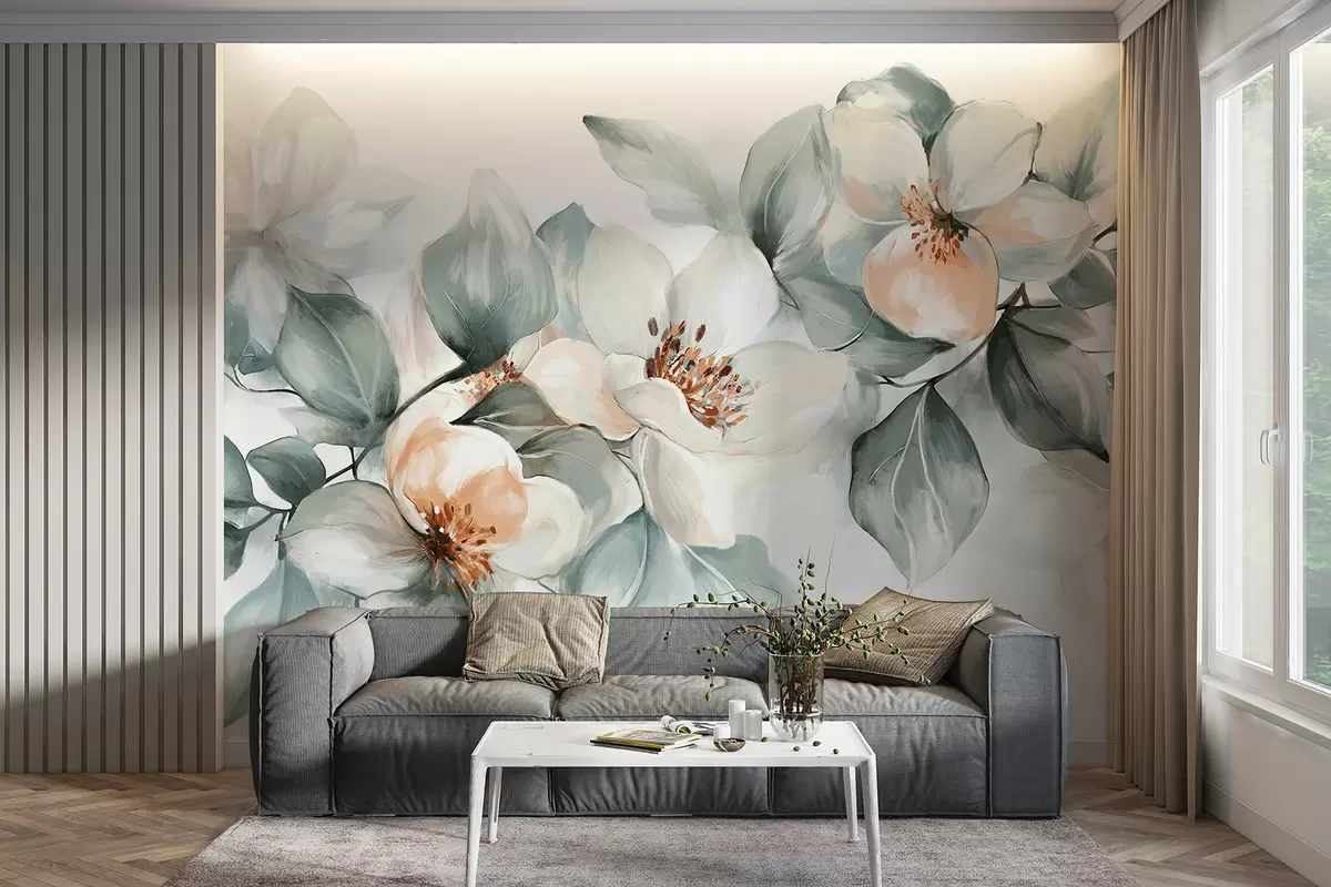 Fotobehang Delicate witte en roze magnolia bloemen met zachtgroene bladeren tegen een lichte achtergrond N° w08220