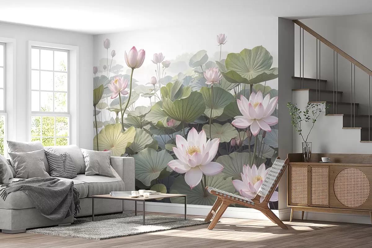 Fotobehang Roze en witte lotusbloemen met grote groene bladeren, omgeven door een mistige, sfeervolle achtergrond N° w08221