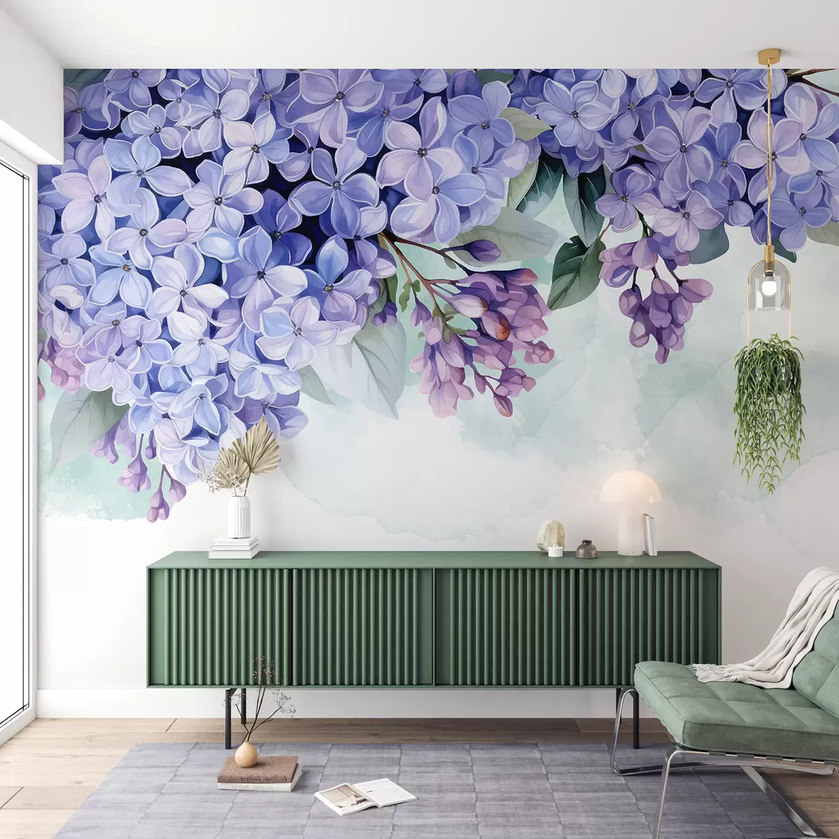 Fotobehang Levendige paarse hortensiabloemen met groene bladeren, die het frame vullen tegen een zachte, wazige achtergrond N° w08223