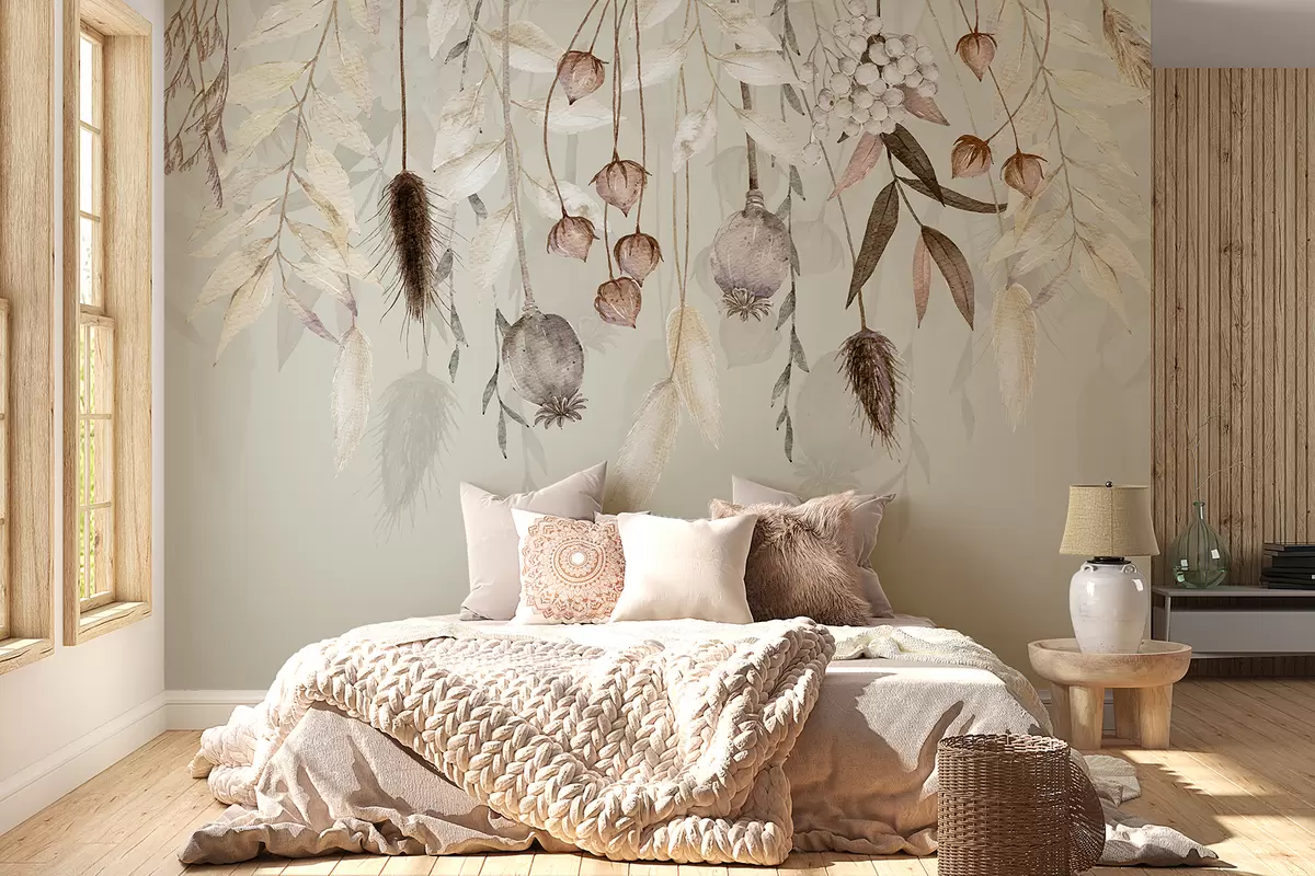Fotobehang Delicate bloemstukken met gedroogde bloemen, bladeren en veren die tegen een zachte achtergrond hangen N° w08230