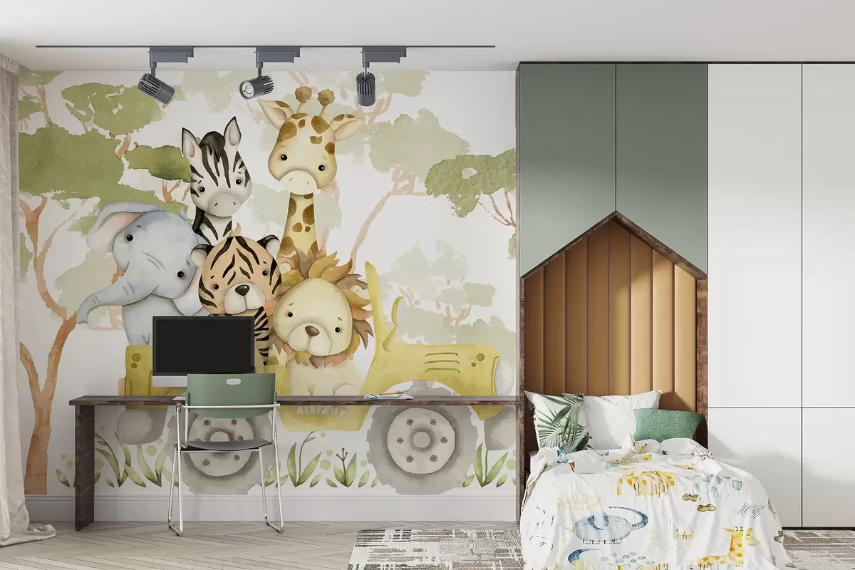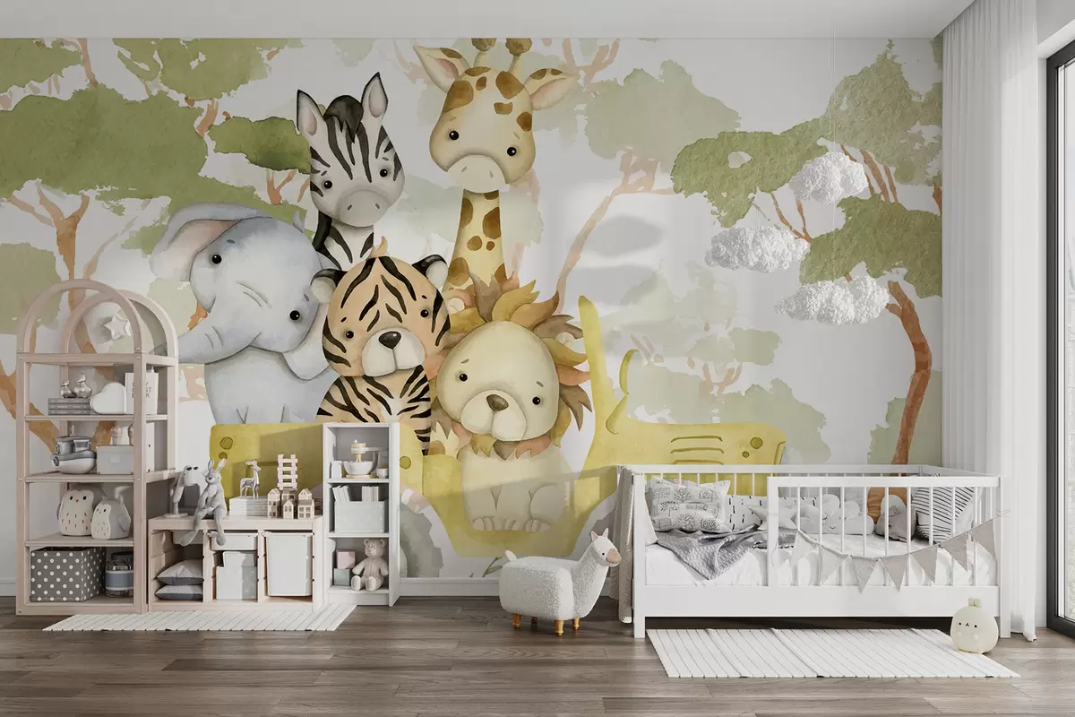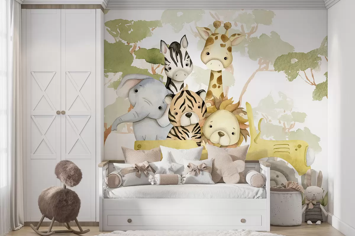 Fotobehang Een gele speelgoedvrachtwagen met een giraffe, een tijger, een konijn en een olifant, tegen een achtergrond van groen gebladerte N° w08233