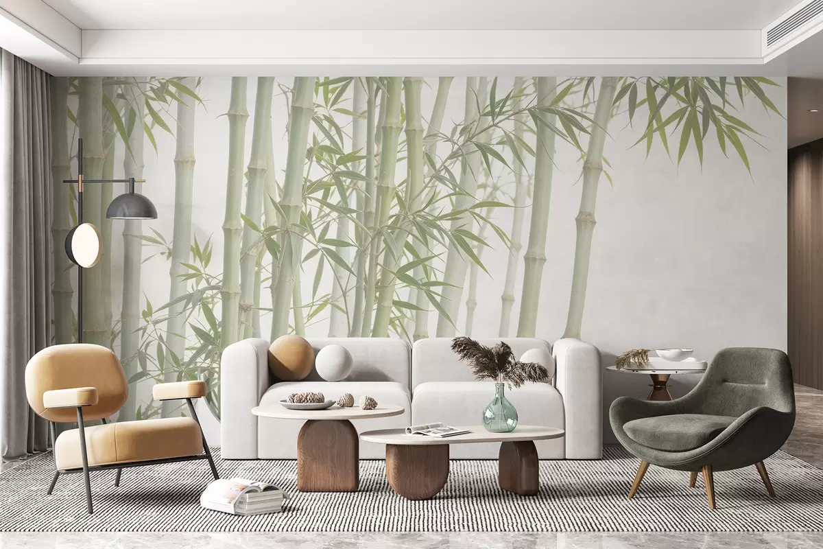 Fotobehang Een dicht bamboebos met hoge bamboestengels en groene bladeren tegen een zachte, wazige achtergrond N° w08237