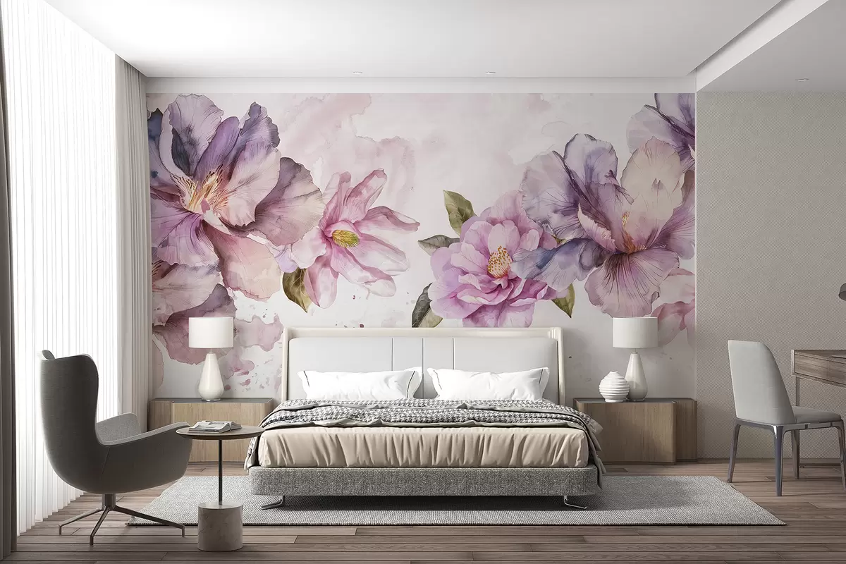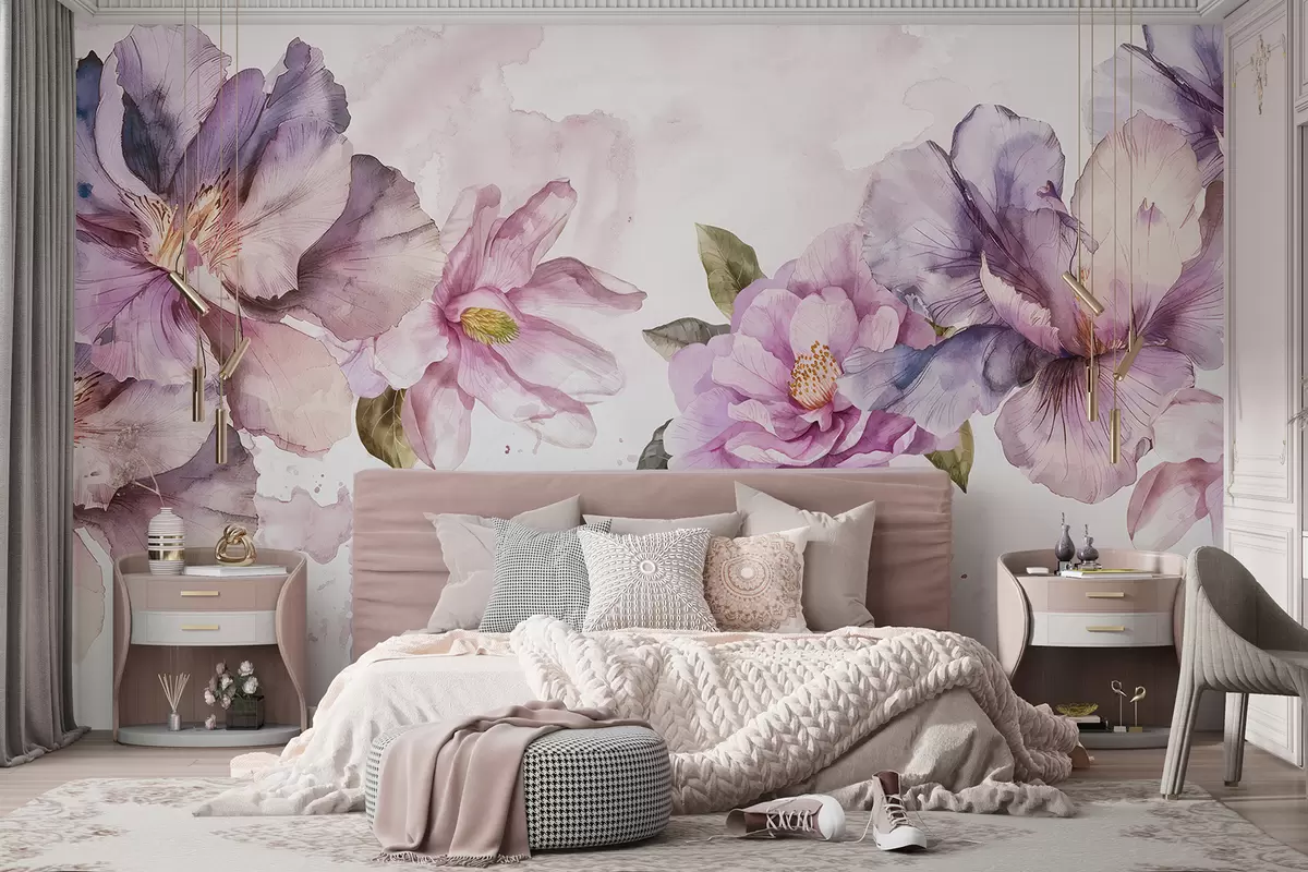 Fotobehang Delicate roze en paarse aquarelbloemen met zachte bloemblaadjes en groene bladeren tegen een lichte achtergrond N° w08238
