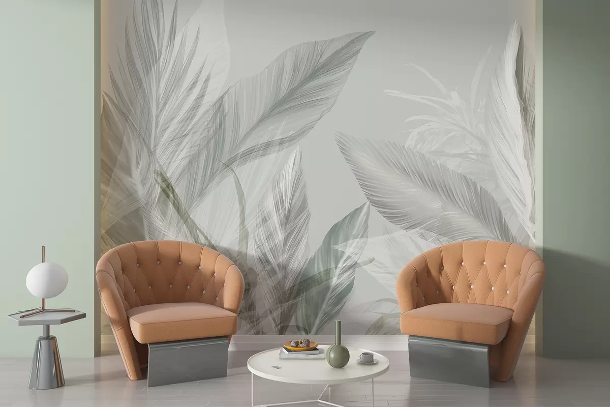 Fotobehang Zachte witte, groene en grijze veren en tropische bladeren zweven tegen een lichte achtergrond N° w08241