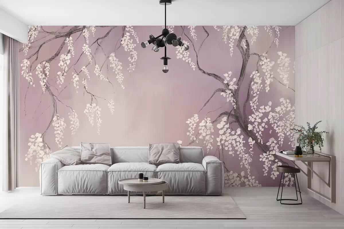 Fotobehang Delicate witte kersenboom met bloeiende bloemen op takken tegen een roze achtergrond N° w08243v2