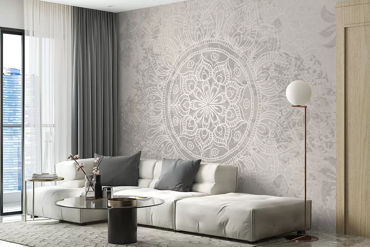 Fotobehang Een gedetailleerd wit mandalapatroon op een lichtgrijze vintage achtergrond met textuur N° w08246