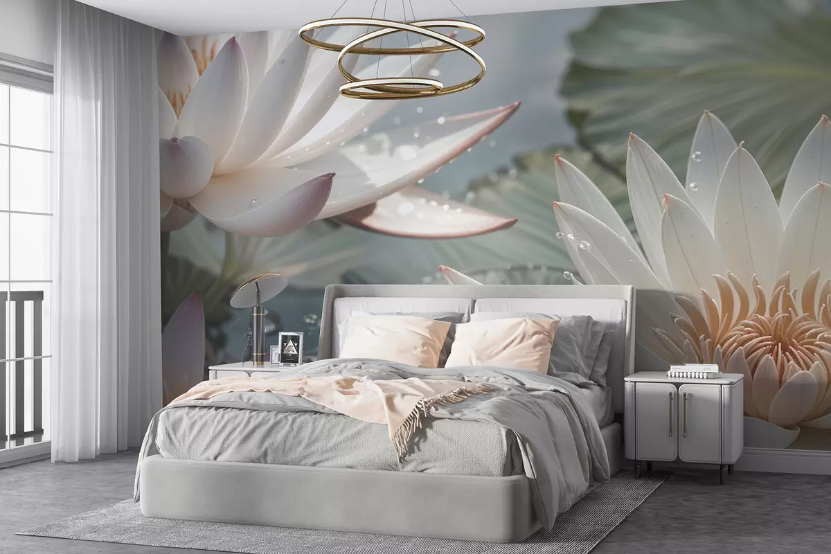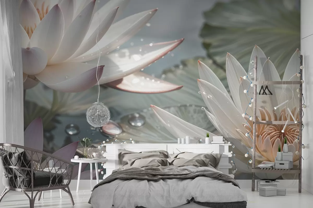 Fotobehang Een close-up van witte lotusbloemen met waterdruppels op hun bloemblaadjes tegen een wazige groene achtergrond N° w08252