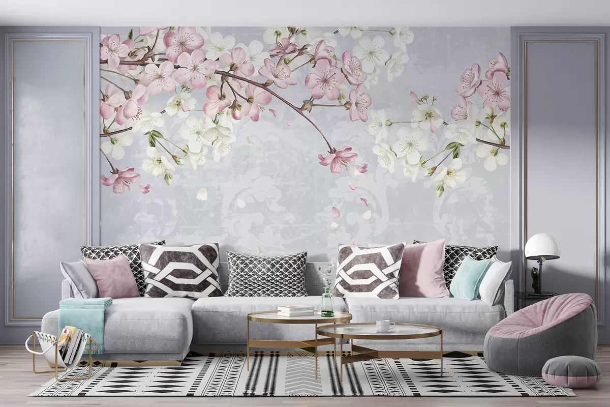 Fotobehang Roze en witte kersenbloesembloemen in volle bloei, met zachte bloemblaadjes tegen een blauwe achtergrond met textuur N° w08254