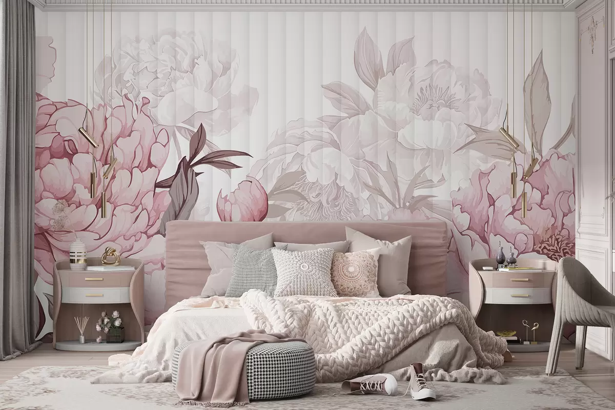 Fotobehang Een close-up van grote, delicate roze en witte pioenbloemen tegen een zachte, gestructureerde achtergrond N° w08255