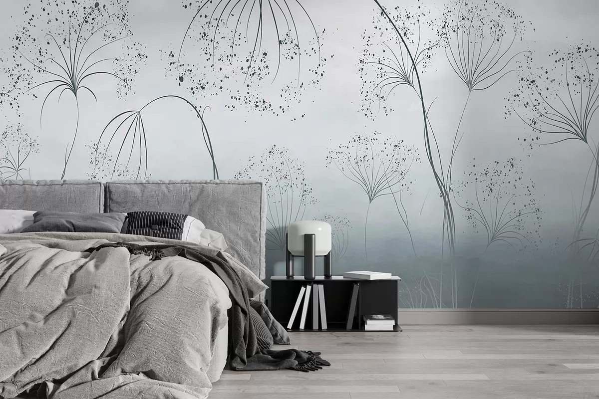 Fotobehang Blauwe hoge, slierterige planten met tere, parapluvormige bloemen of zaadhoofden in een mistige, sfeervolle omgeving N° w08258v1