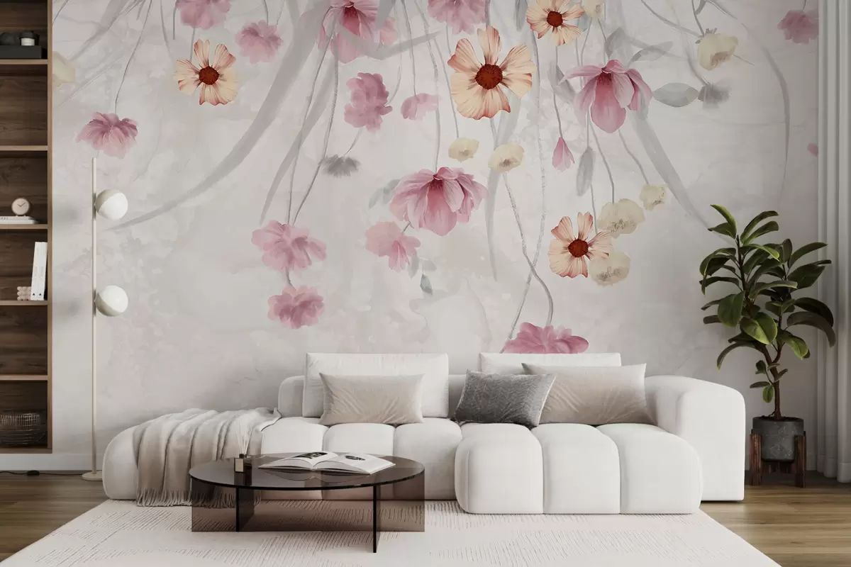 Fotobehang Delicate pastelroze en gele bloemen met gele harten op een zachte, onscherpe achtergrond N° w08261v1